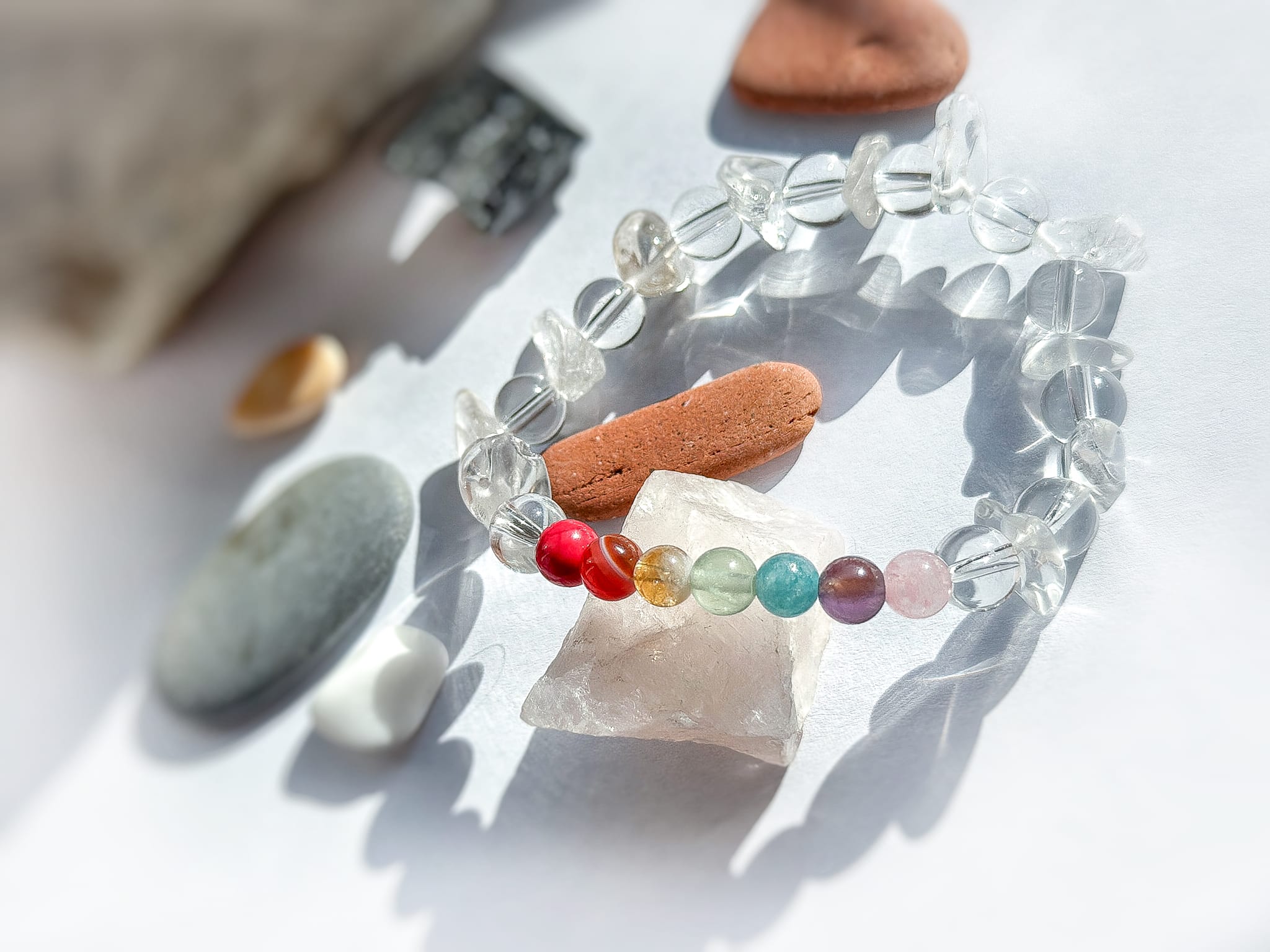 Kolorowe kamienie tworzą subtelny akcent nawiązujący do symboliki siedmiu czakr siedmiu obszarów ludzkiego doświadczenia, które w tradycjach duchowych symbolicznie opisują różne aspekty życia: od poczucia bezpieczeństwa i emocji, po komunikację, intuicję i świadomość.
