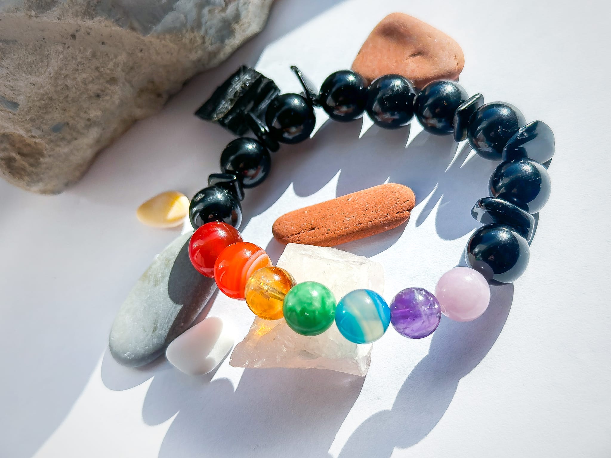 Połączenie czarnego turmalinui z barwami czakr tworzy kompozycję, która przypomina o harmonii między stabilnością a przepływem energii życia.