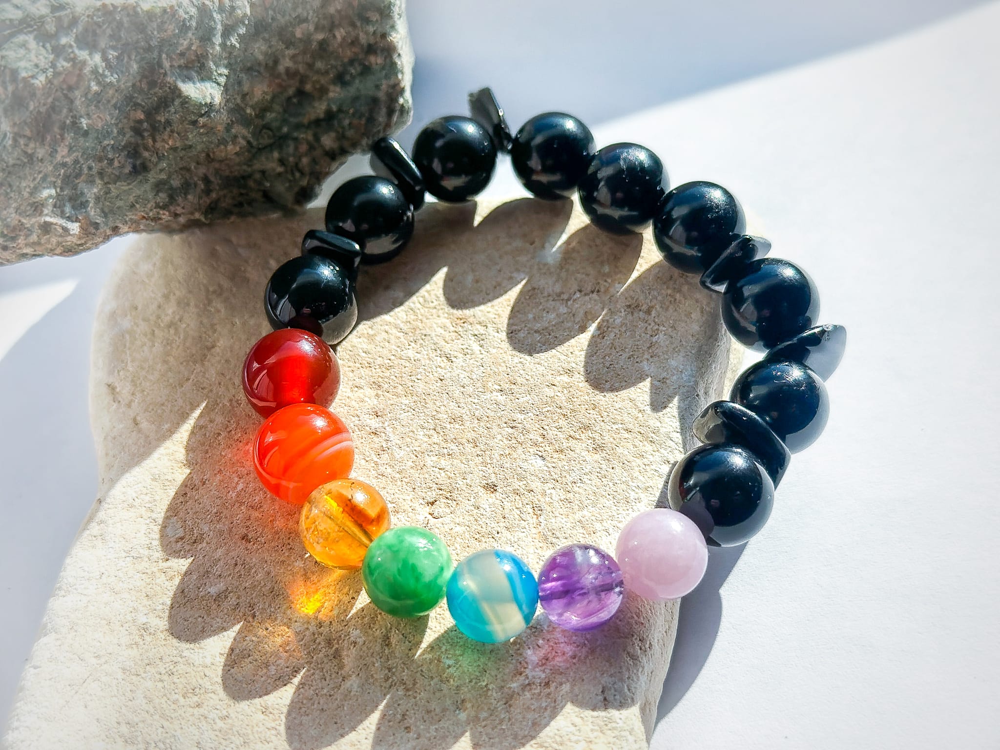 Kolorowe kamienie nawiązują do symboliki siedmiu czakr, które w wielu tradycjach opisują różne obszary ludzkiego doświadczenia od poczucia bezpieczeństwa, przez emocje i relacje, aż po intuicję i świadomość. W tej bransoletce każdy kamień jest jak małe przypomnienie o harmonii między ciałem, umysłem i sercem.