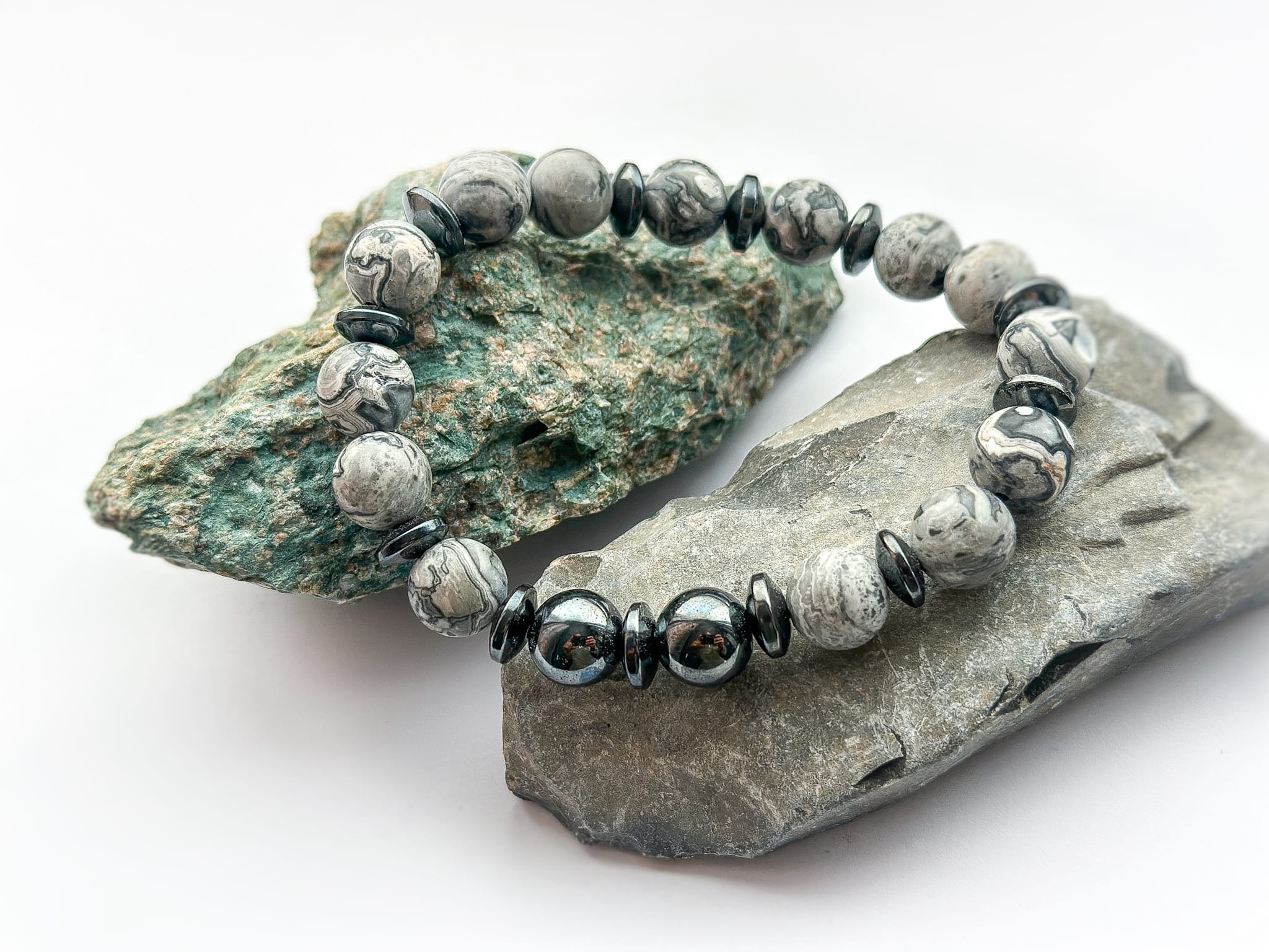 Jaspis to naturalny kamień półszlachetny o charakterystycznej, stonowanej kolorystyce z unikalnymi wzorami przypominającymi krajobrazy, żyłki lub subtelne fale. Jego barwa może obejmować odcienie szarości, beżu i grafitu, a naturalne desenie powstają w wyniku procesów geologicznych zachodzących przez miliony lat. Kamień ten ceniony jest zarówno za swój spokojny, elegancki wygląd, jak i symboliczne znaczenie.
