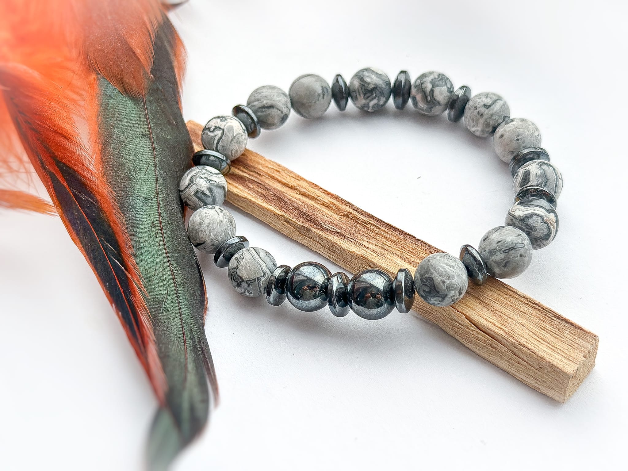 Połączenie jaspisu i hematytu tworzy kompozycję spokojną, elegancką i ponadczasową łączącą naturalność z subtelną siłą oraz opanowaniem.