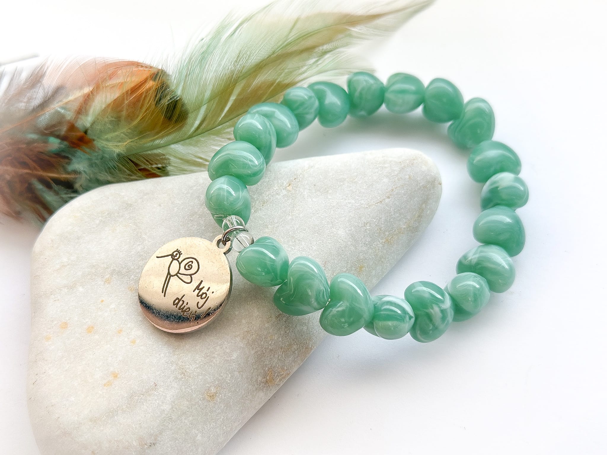 Bransoletka jest wykończona zawieszką ze stali szlachetnej z rysunkiem projektu Beaty Pawlikowskiej „Mój Dzień”. Ten drobny element dodaje jej osobistego, ciepłego charakteru i sprawia, że całość nabiera wyjątkowego, pozytywnego tonu.