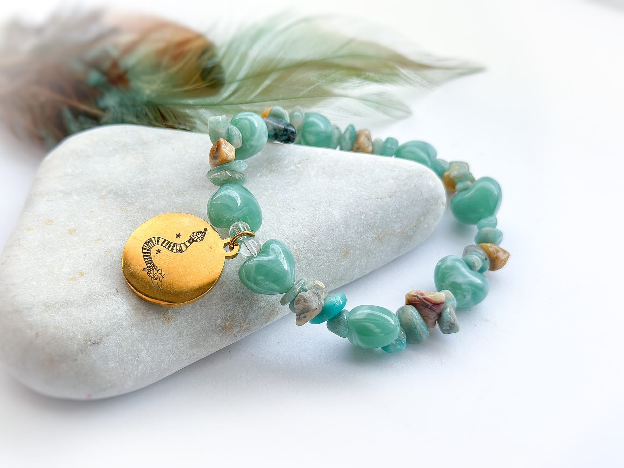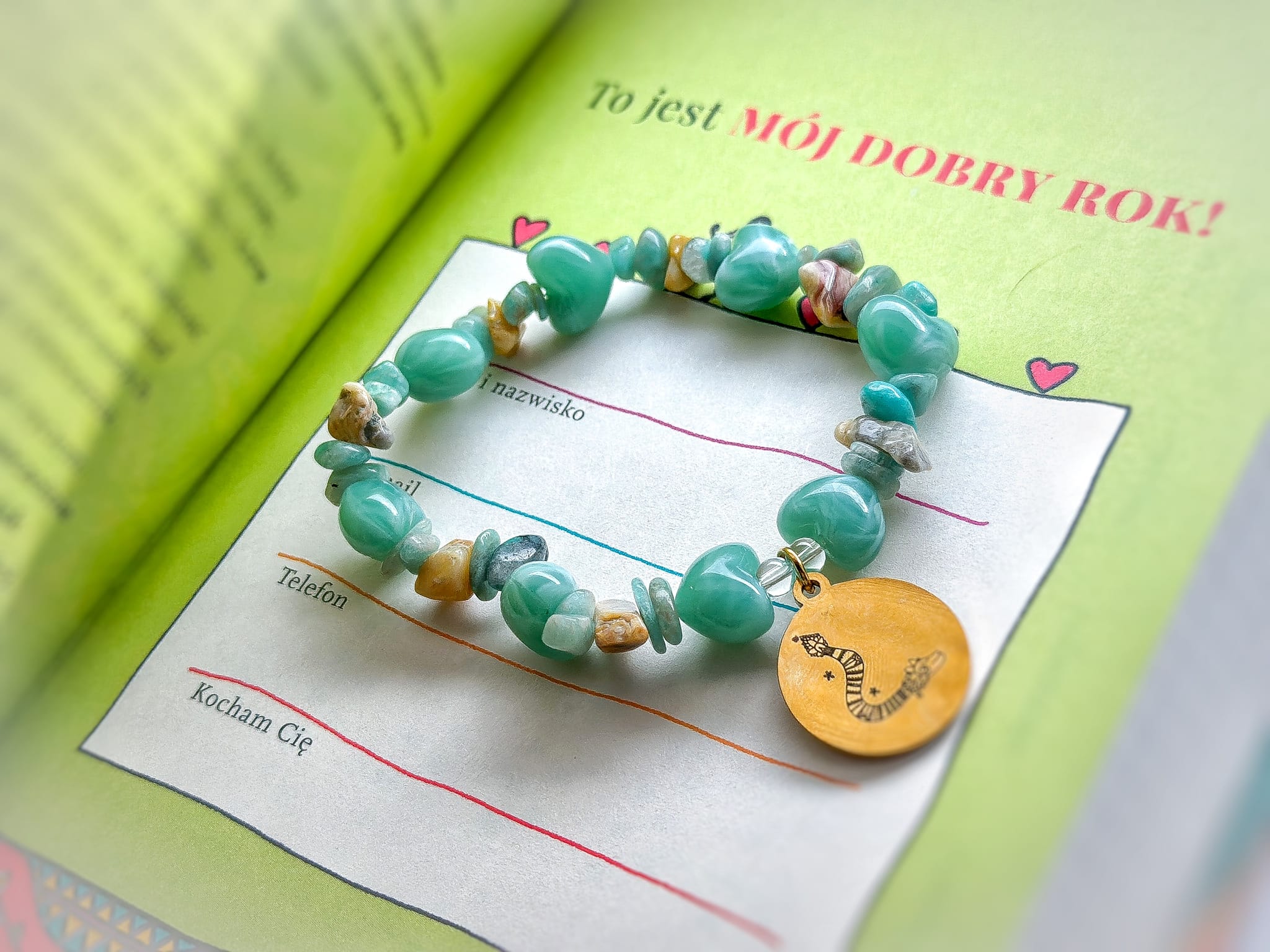 Amazonit z kolei często kojarzono z spokojem serca i łagodnym, wyważonym podejściem do siebie i innych. Jego miękkie, niebieskozielone odcienie wprowadzały do kompozycji lekkość i oddech. Jaspis natomiast od dawna symbolizował stabilność i cierpliwość był kamieniem, którego naturalne, ziemiste barwy kojarzono z ugruntowaniem i pewnym stąpaniem po ziemi.