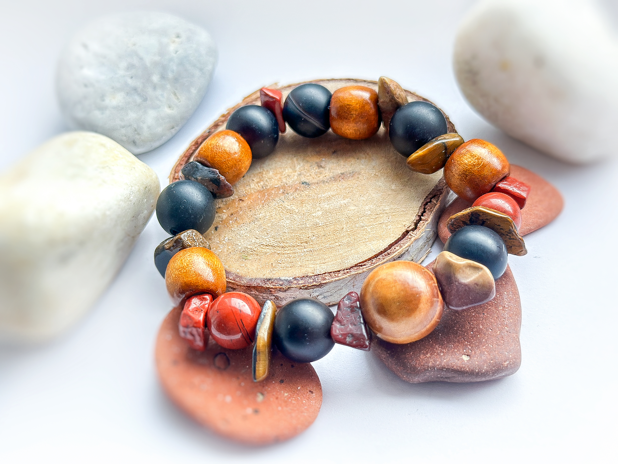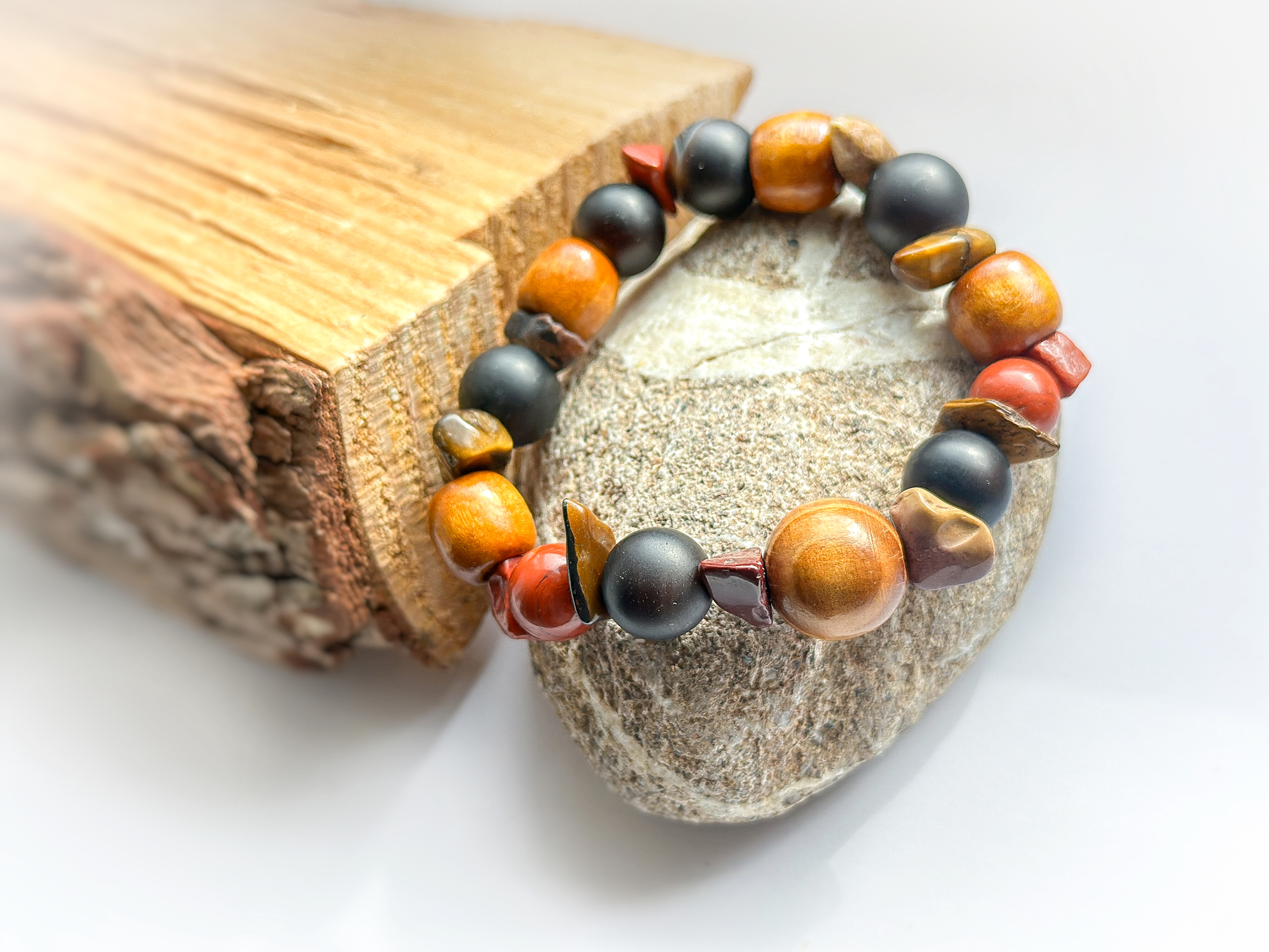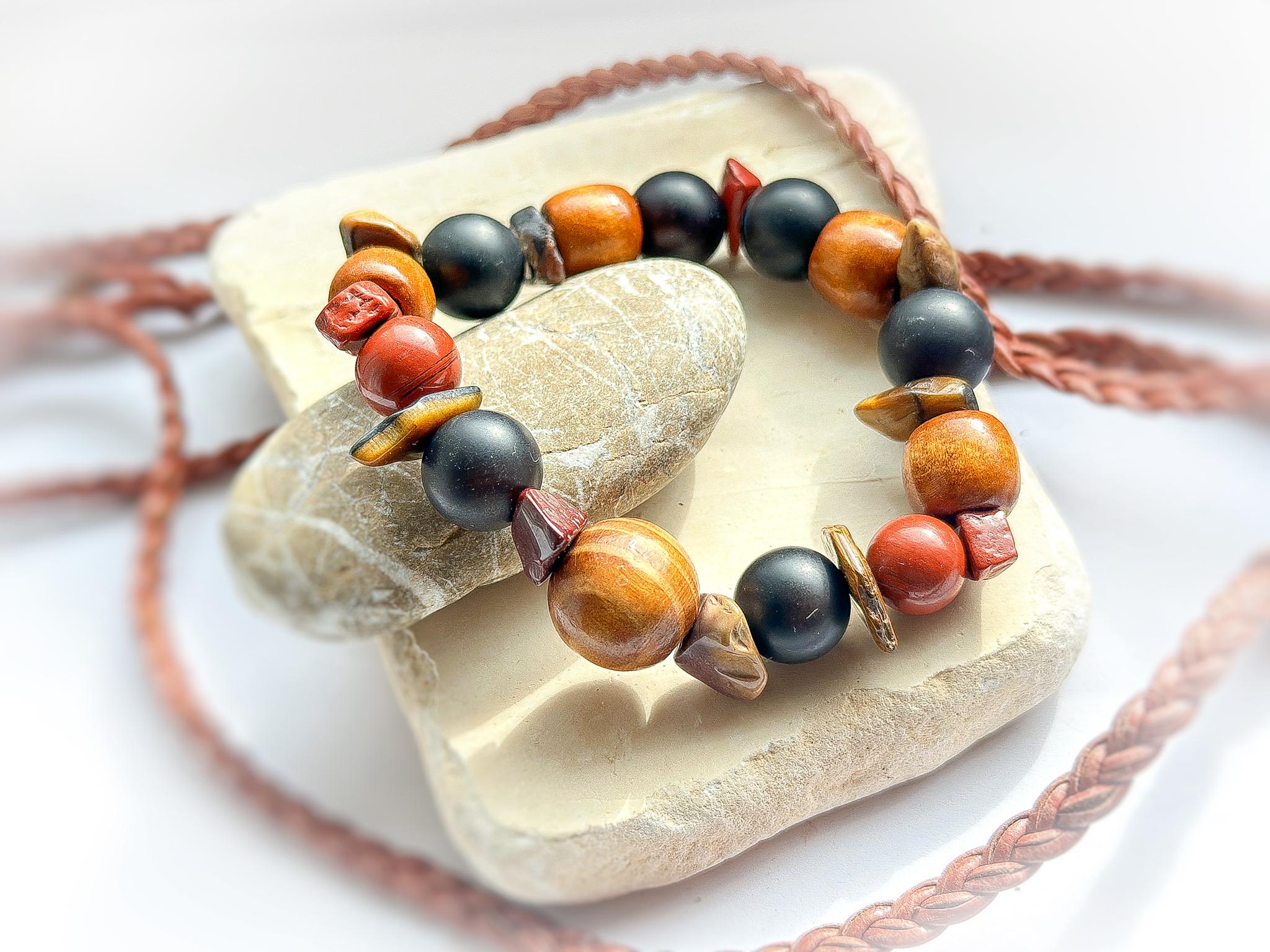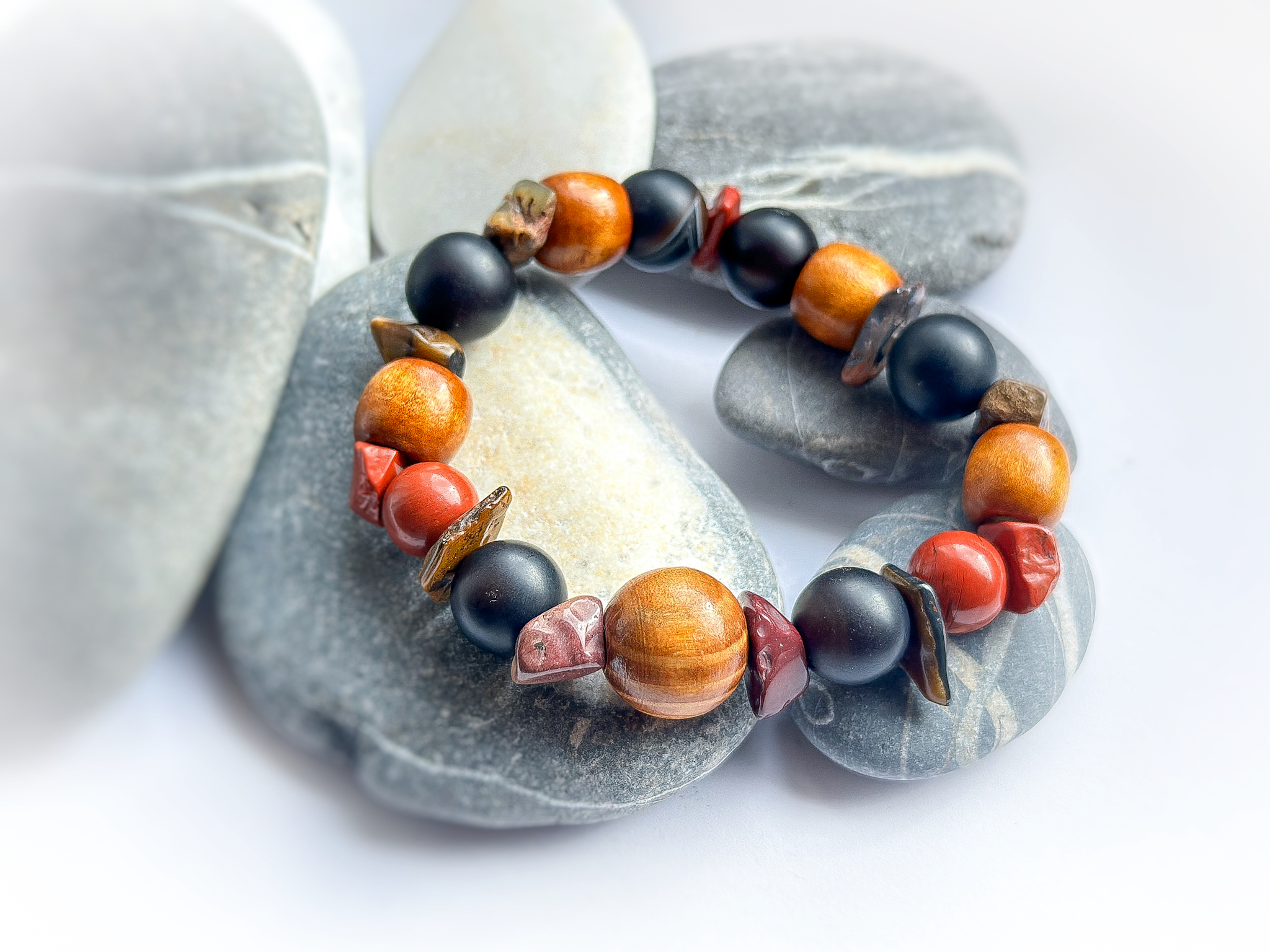 Bransoletka z czerwonego jaspisu, tygrysiego oka i drewnianych koralików