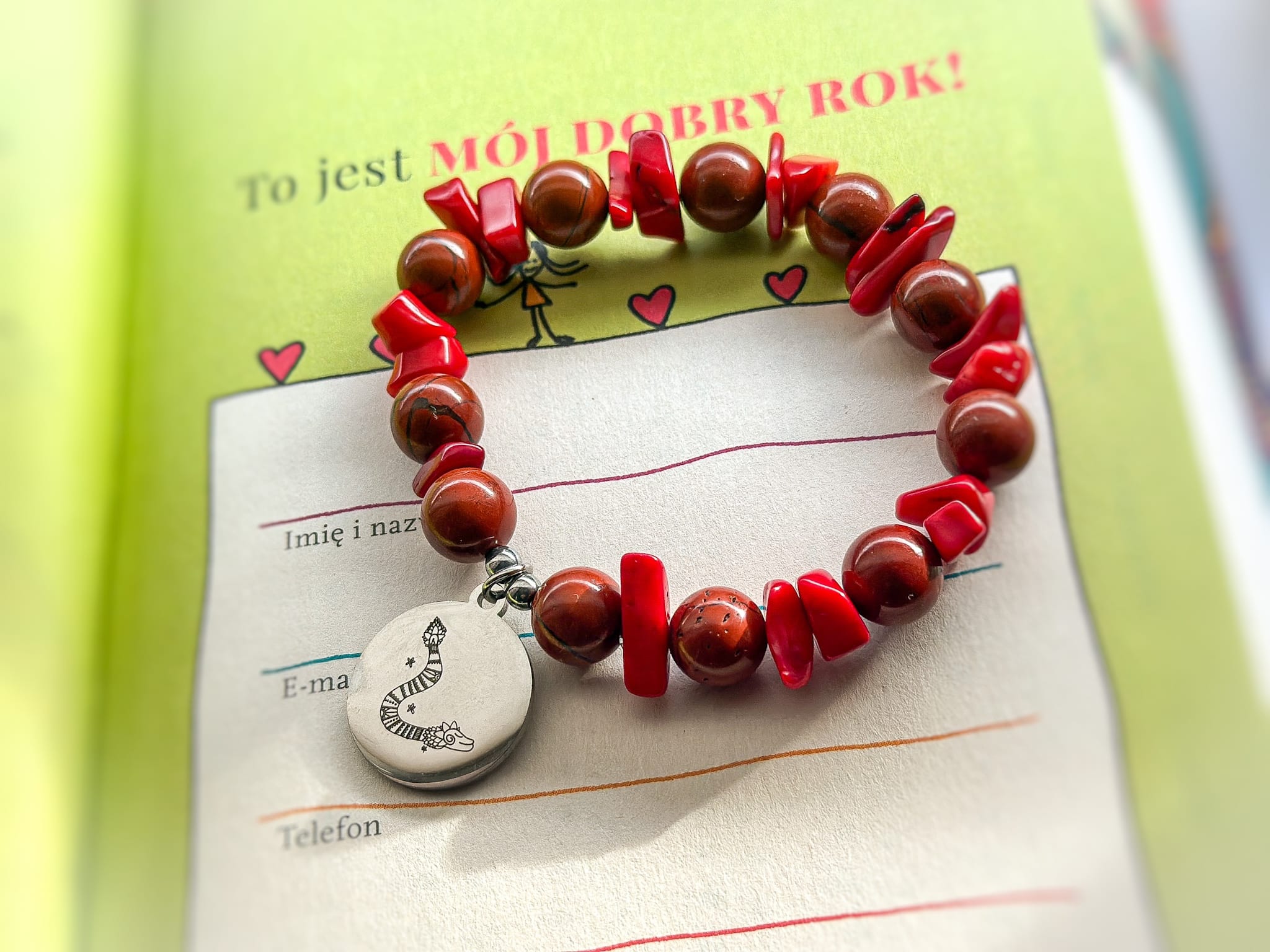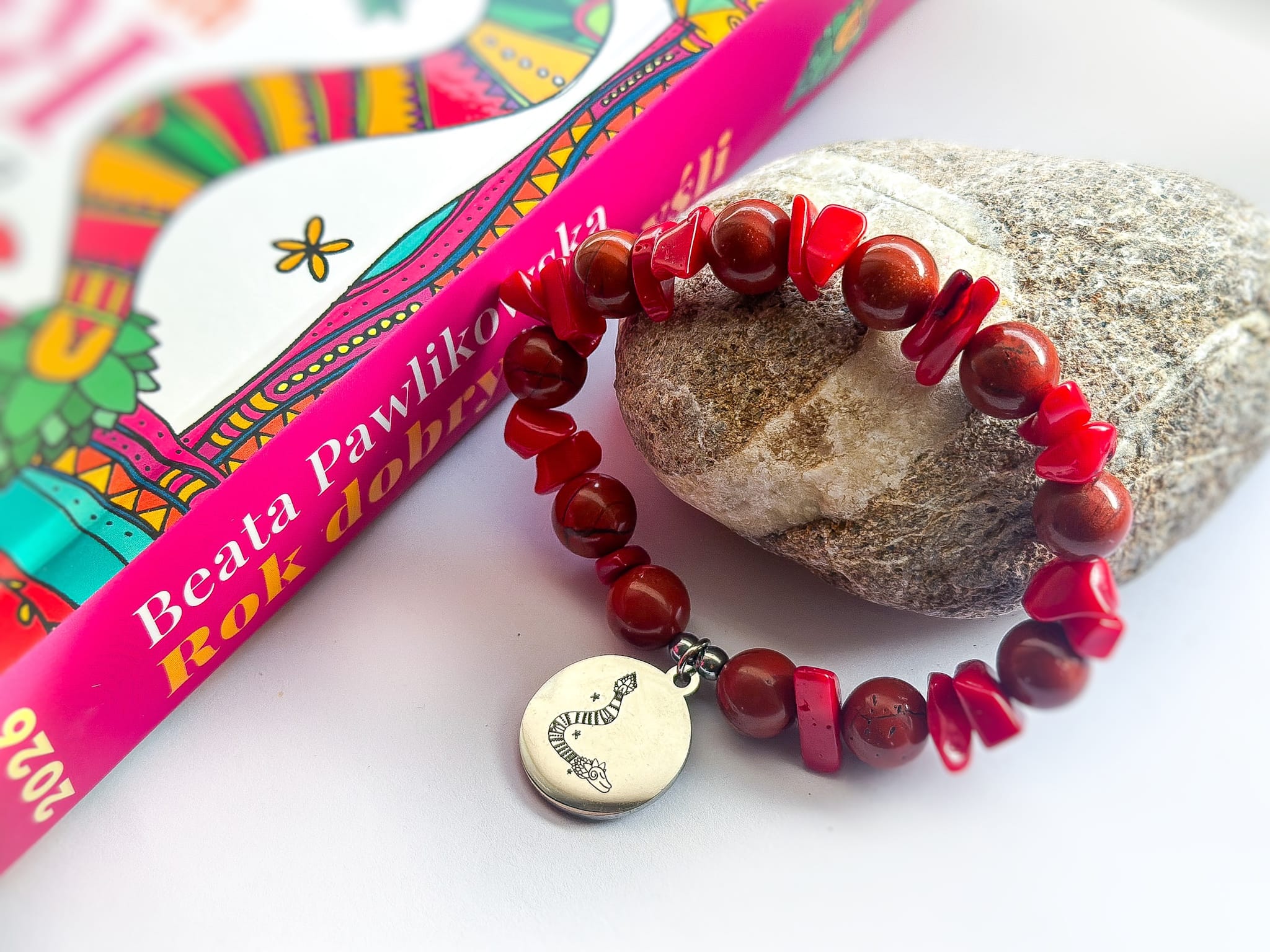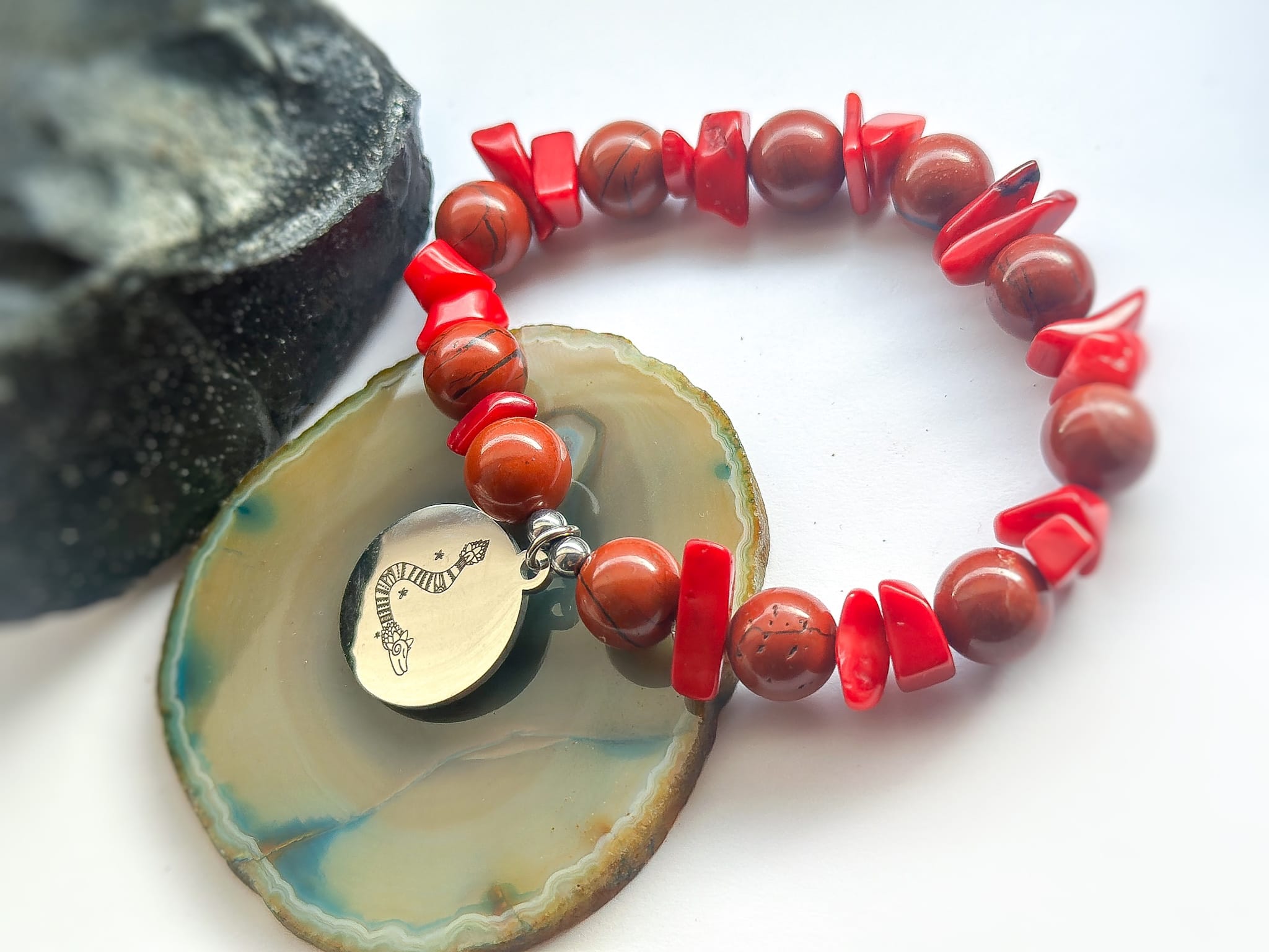 Bransoletka z czerwonego jaspisu z przywieszką „Pierzasty wąż” w odcieniu srebra– projekt Beaty Pawlikowskiej