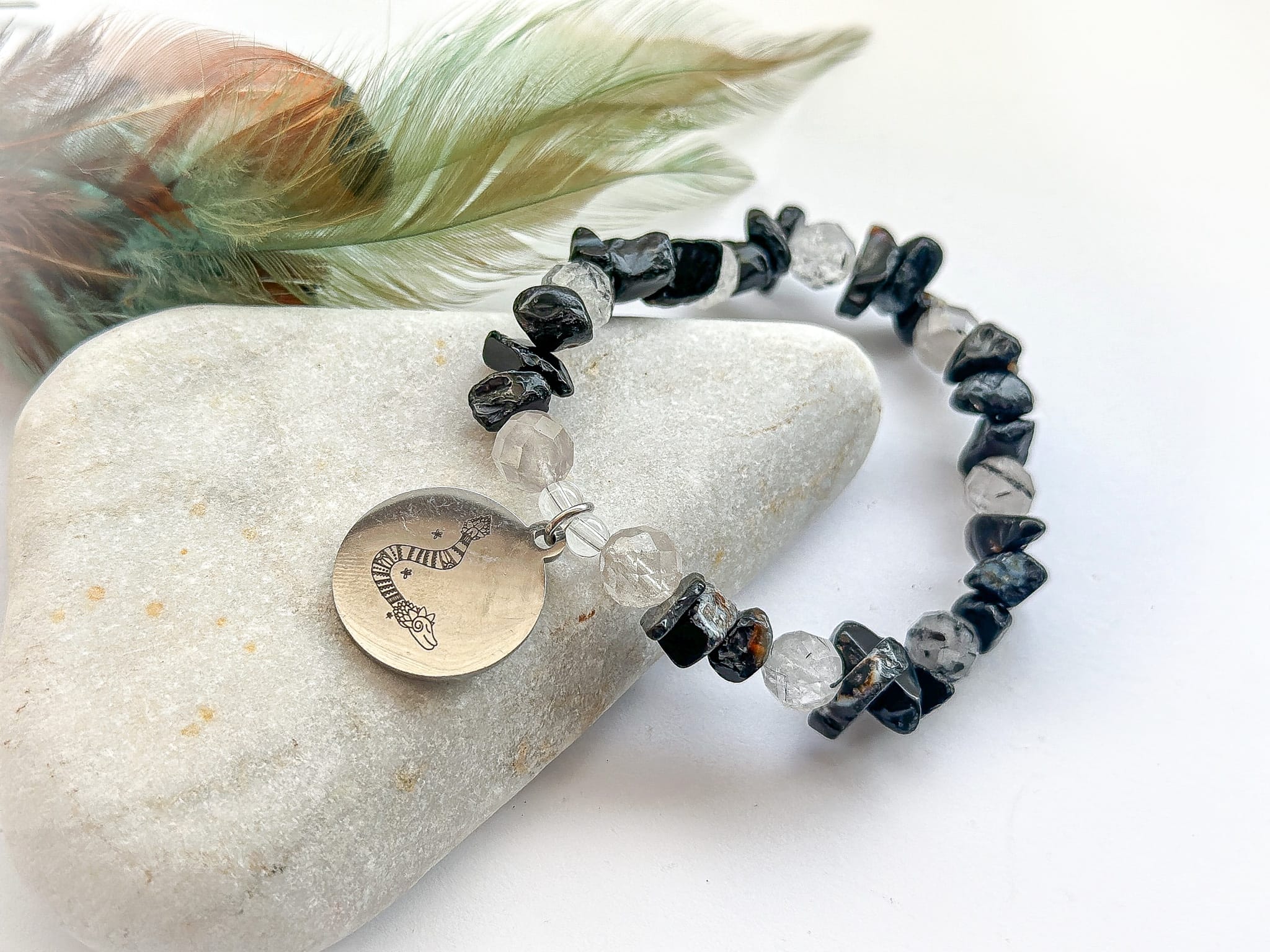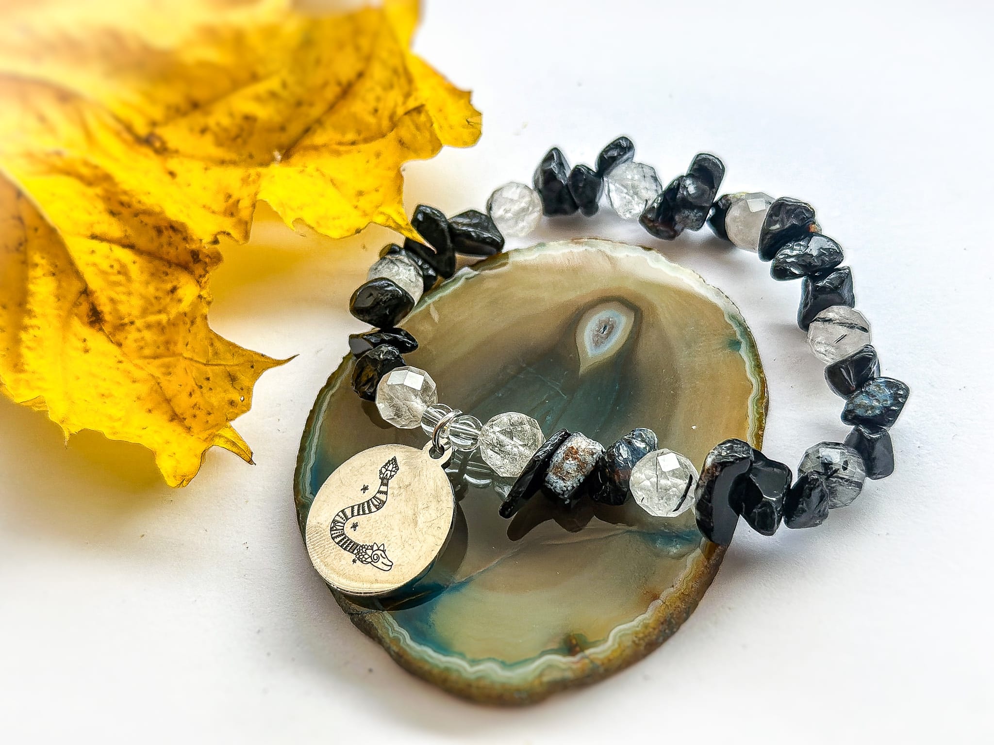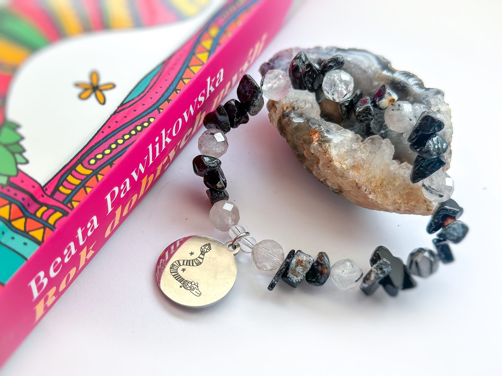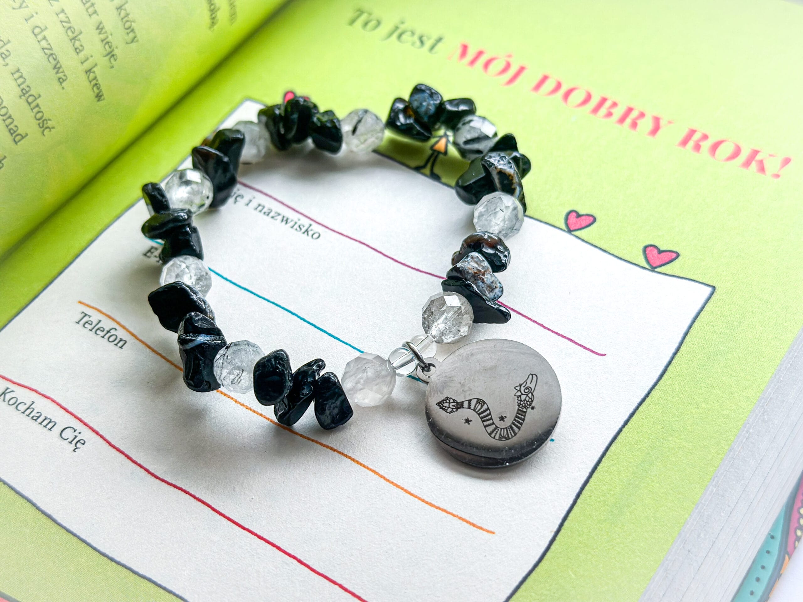 Damska bransoletka z kwarcu turmalinowego i onyksu to połączenie subtelności z wyraźnym charakterem. Delikatne, jasne koraliki kwarcu turmalinowego, przecięte naturalnymi czarnymi nitkami, zestawione zostały z głęboką czernią onyksu razem tworzą kompozycję elegancką, ale z pazurem.