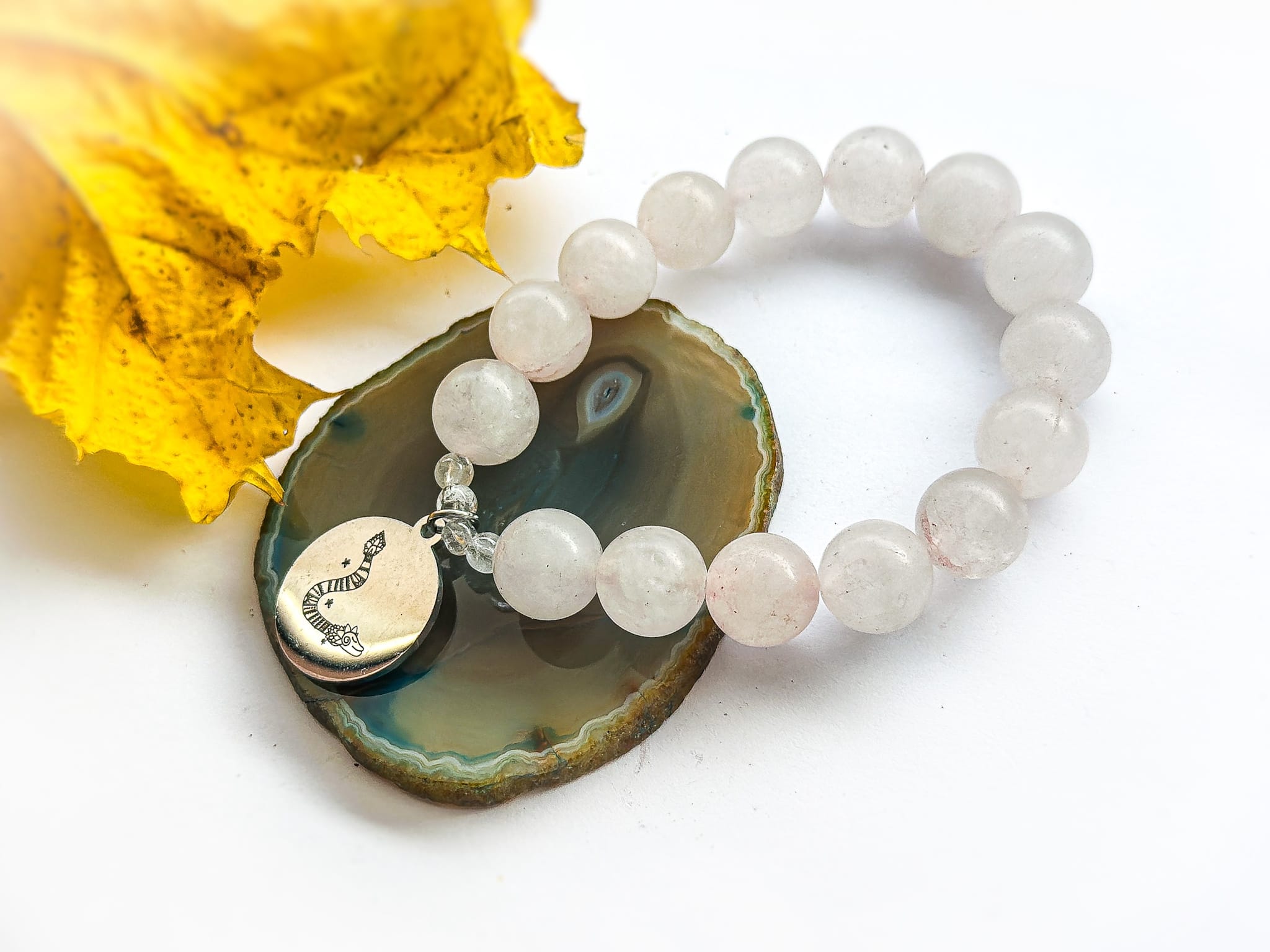 Damska bransoletka z różowego kwarcu, wykończona kryształem górskim, to delikatna, ale wyrazista kompozycja dla osób, które lubią subtelne dodatki z charakterem. Jasnoróżowe koraliki tworzą miękką, łagodną linię, a przejrzysty kryształ górski dodaje całości lekkości i świeżości.