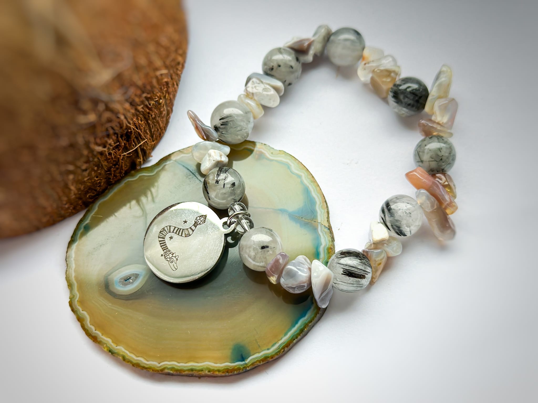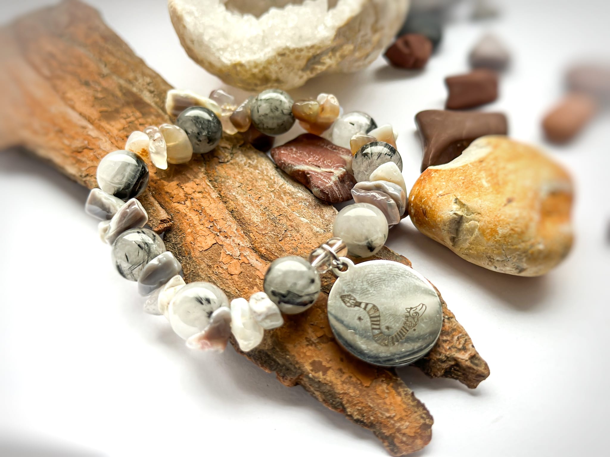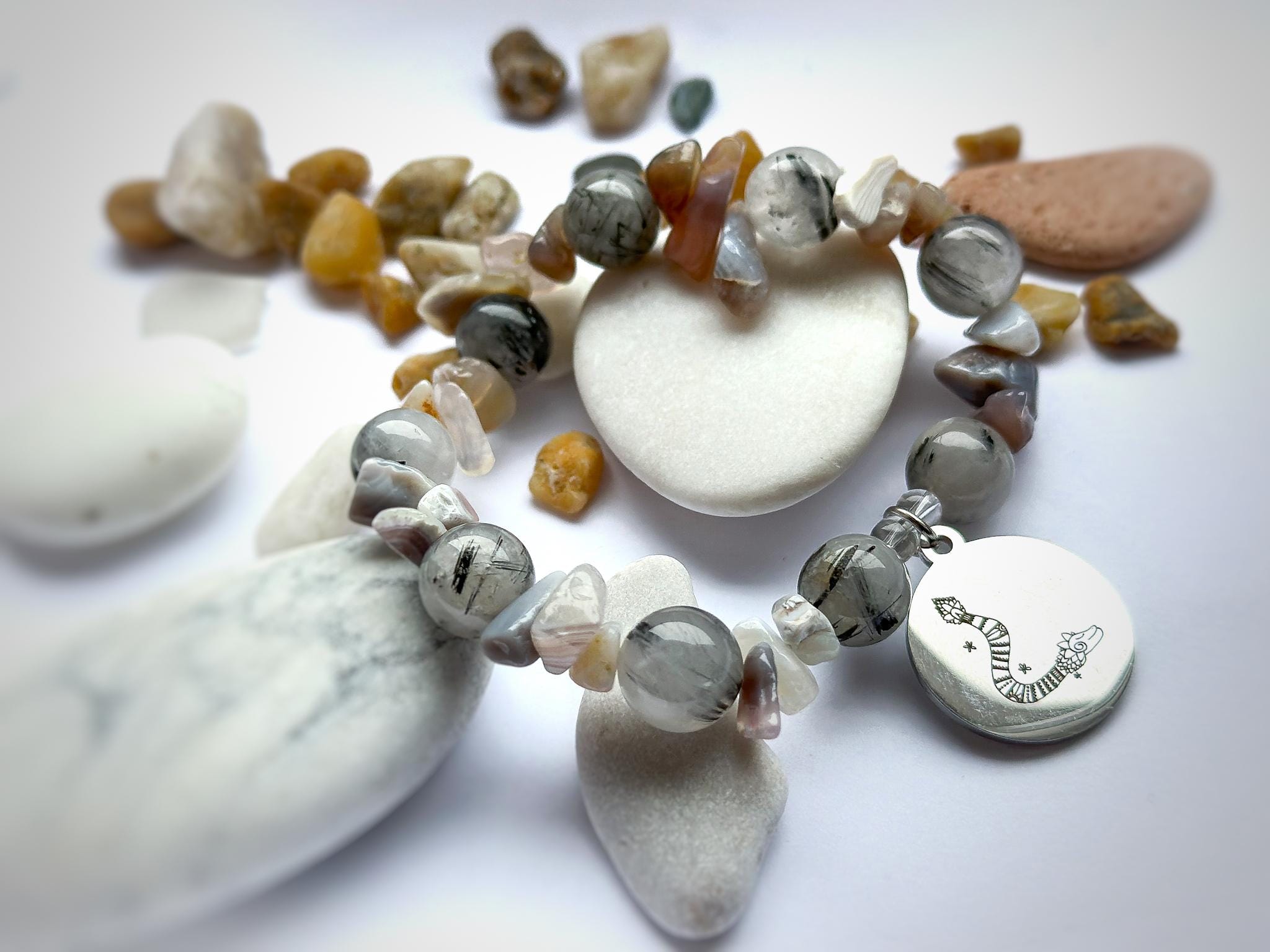 Najnowsza bransoletka została stworzona z połączenia naturalnych kamieni – agatu i kwarcu z turmalinem – oraz unikatowej przywieszki z rysunkiem Beaty Pawlikowskiej, przedstawiającym węża Quetzalcoatl, Pierzastego Węża.
