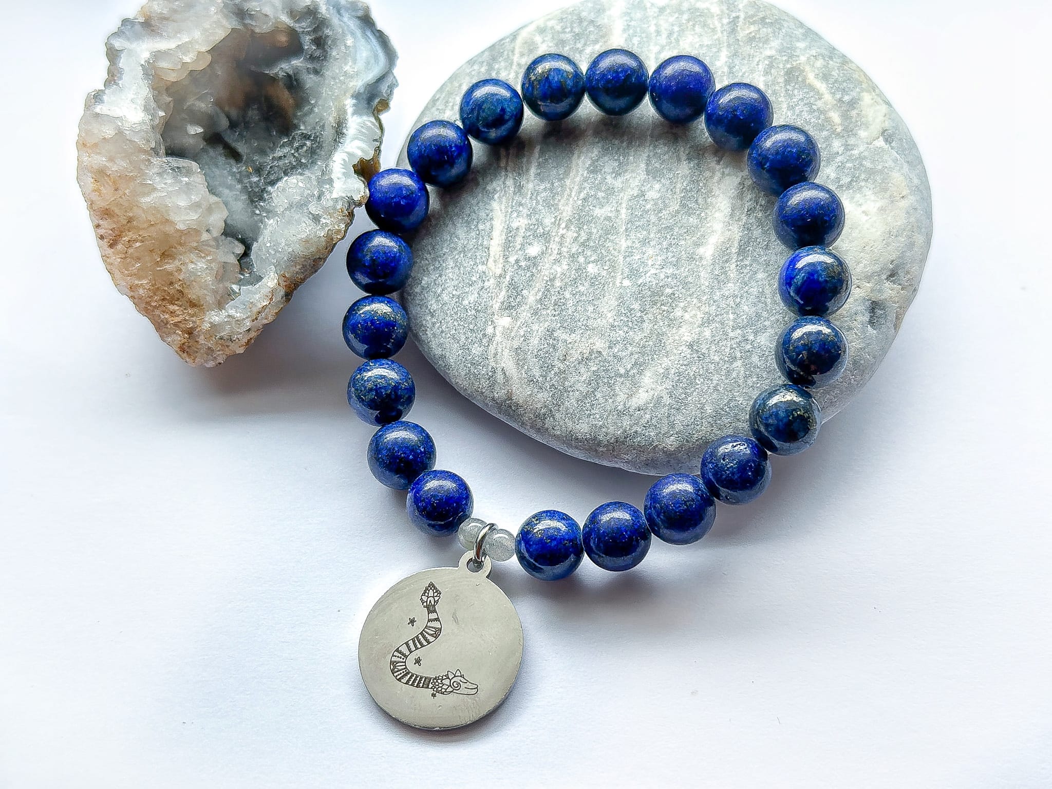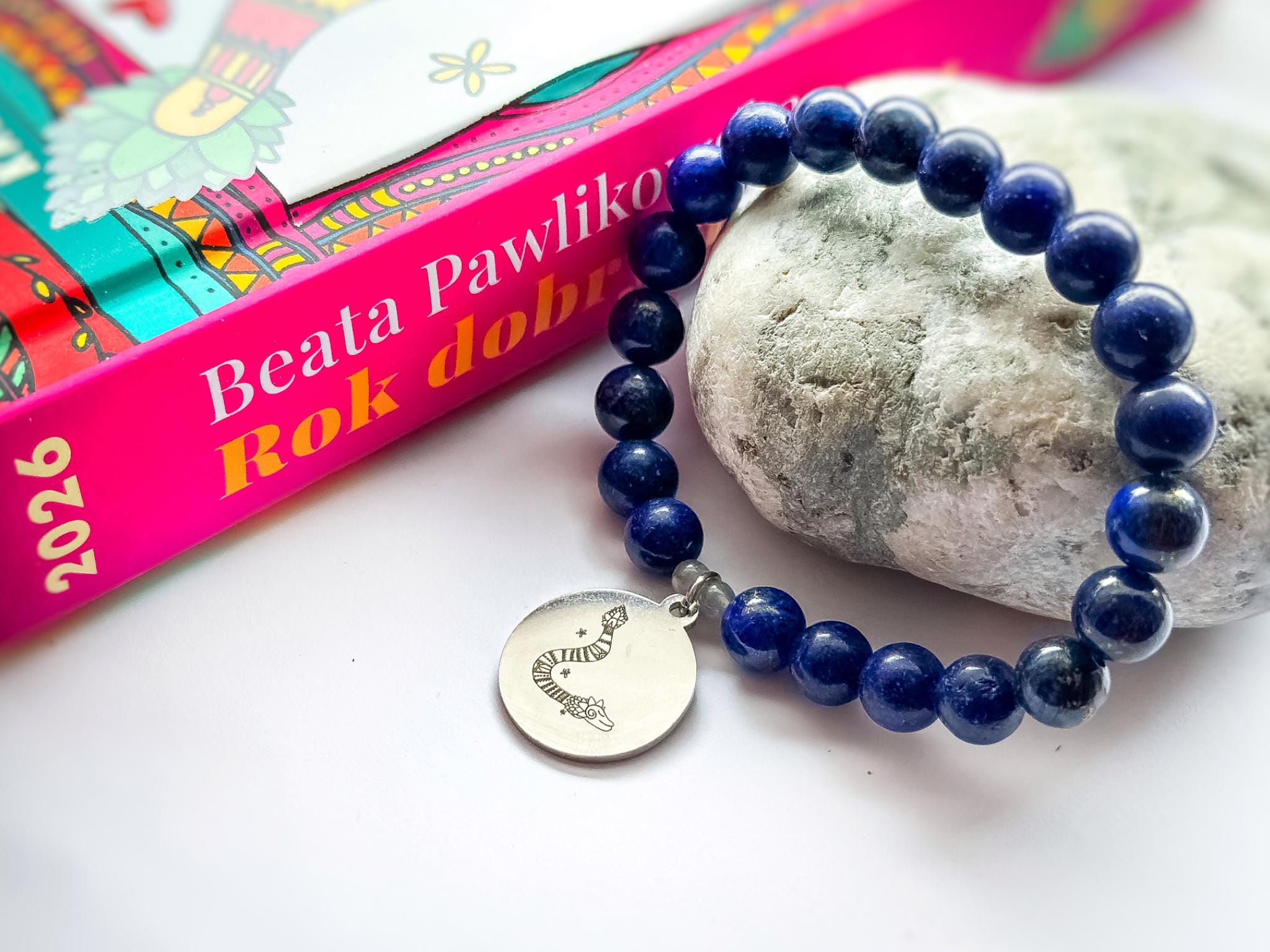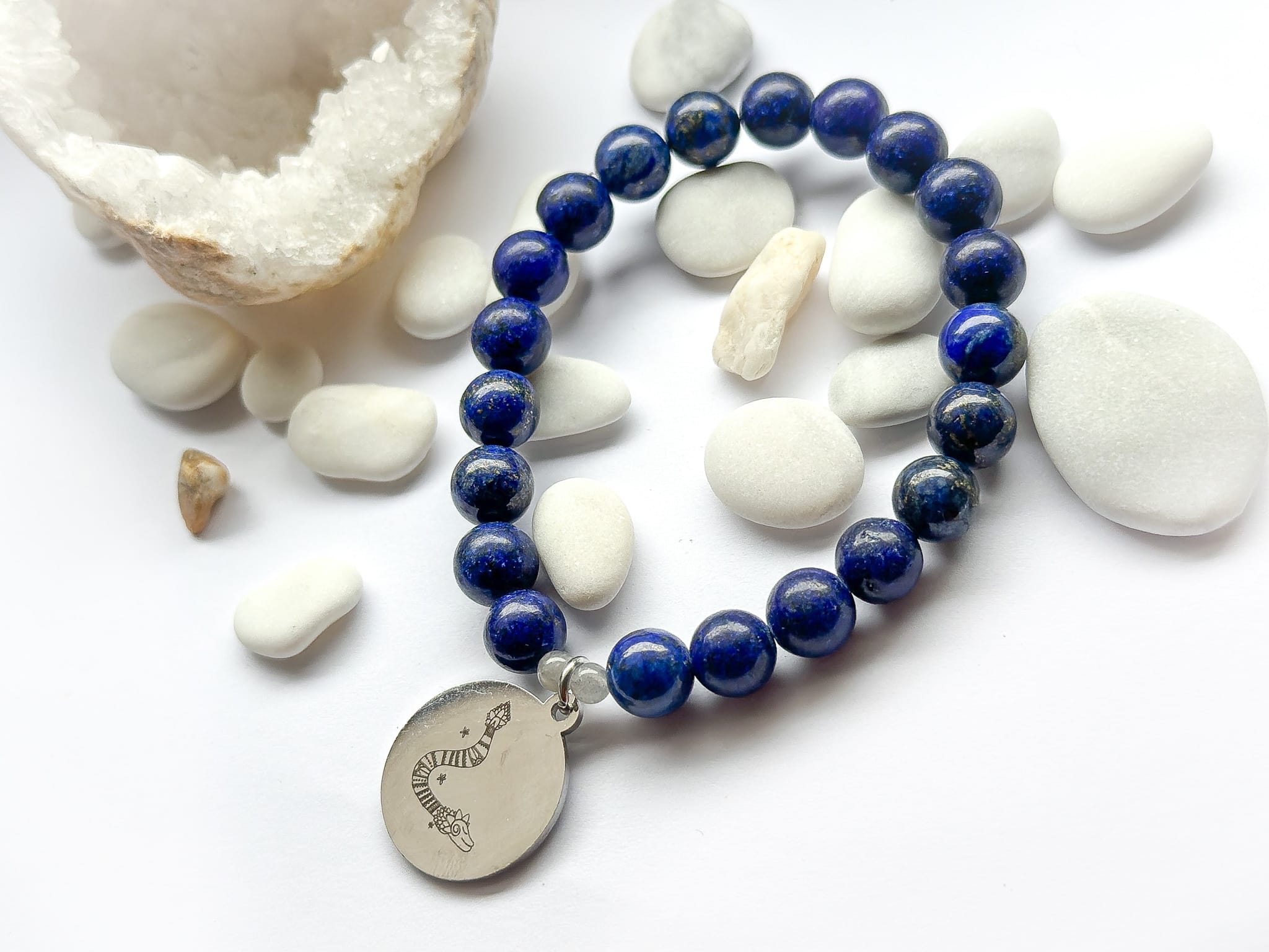 Bransoletka z lapisu lazuli z przywieszką „Pierzasty wąż” w odcieniu srebra– projekt Beaty Pawlikowskiej