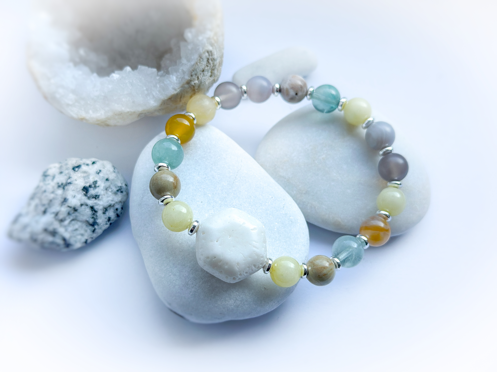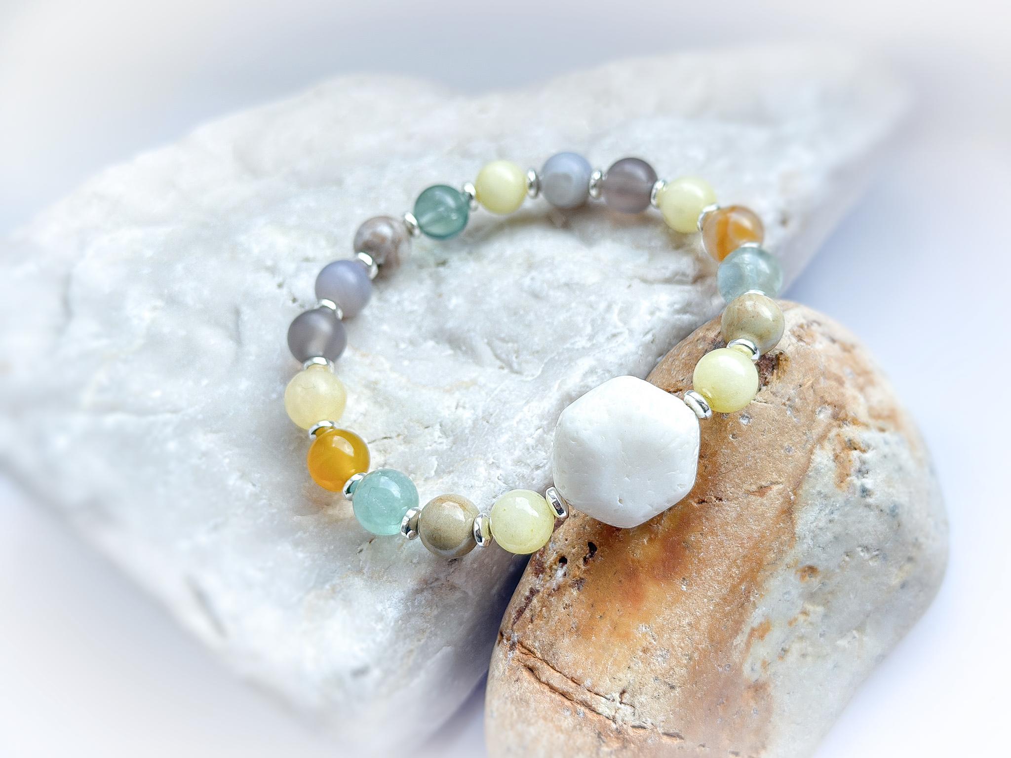 Bransoletka łączy kamienie kojarzone z równowagą, spokojem i naturalnością: