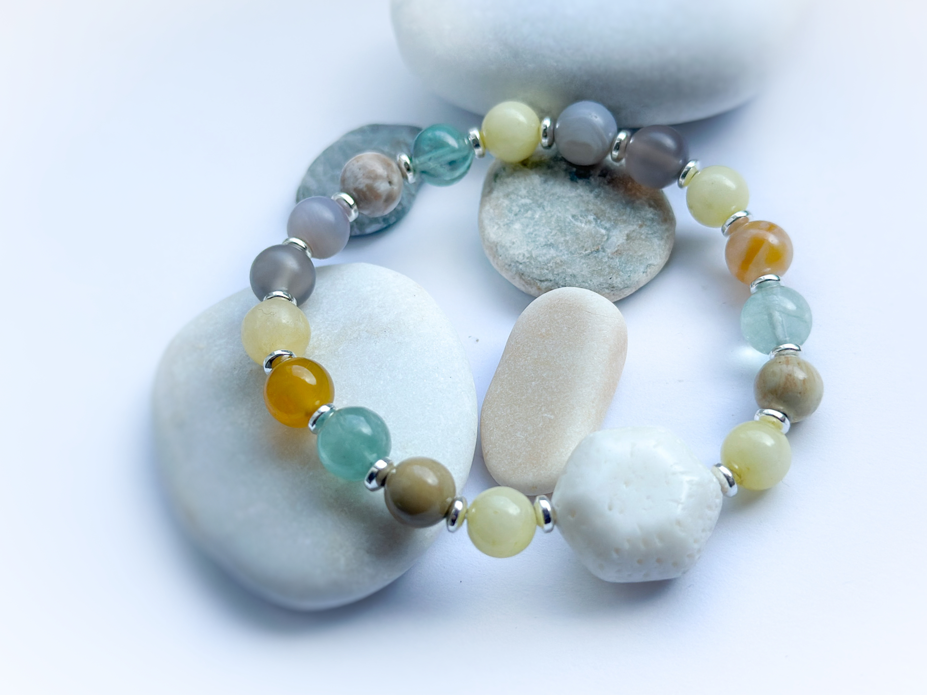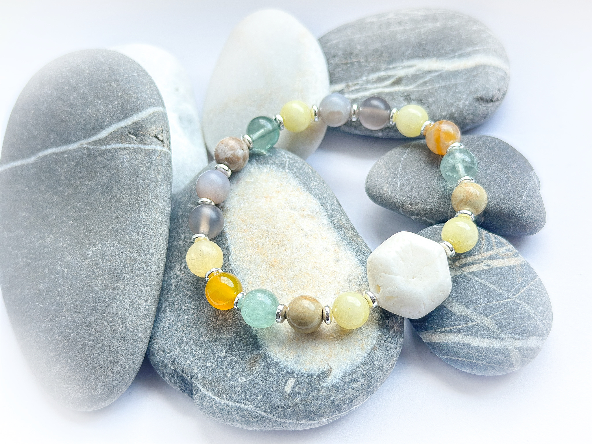 Subtelna, spokojna kolorystycznie bransoletka wykonana z naturalnych kamieni w pastelowych odcieniach szarości, zieleni, kremu i miodowego żółtego. Całość dopełniają przekładki z hematytu, które dodają eleganckiego wykończenia i delikatnego połysku.