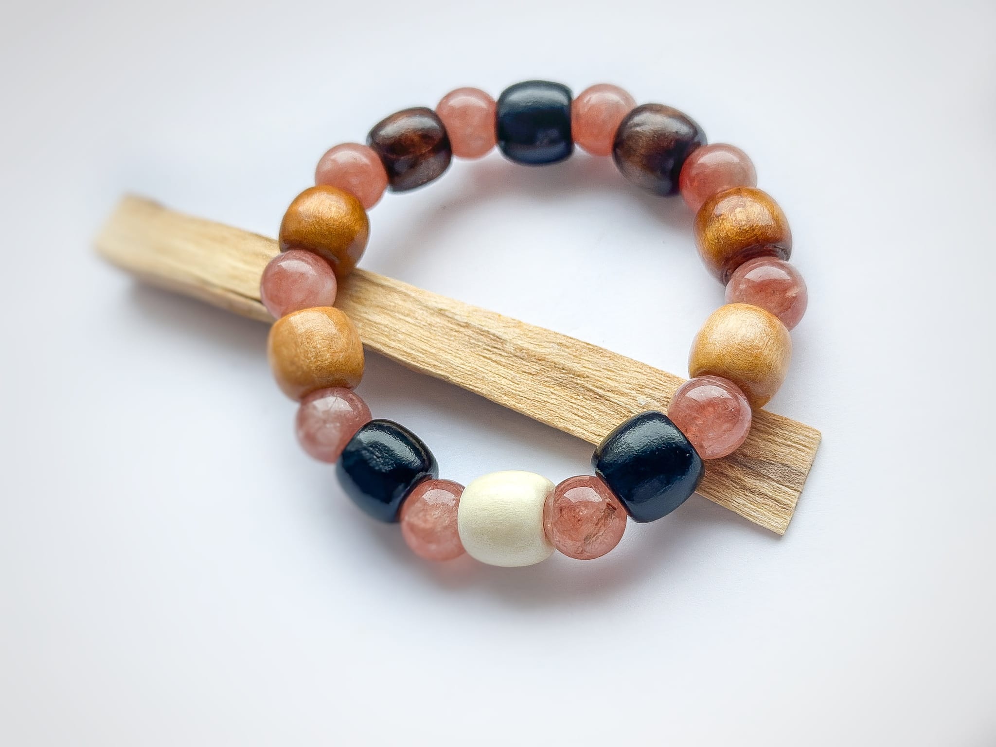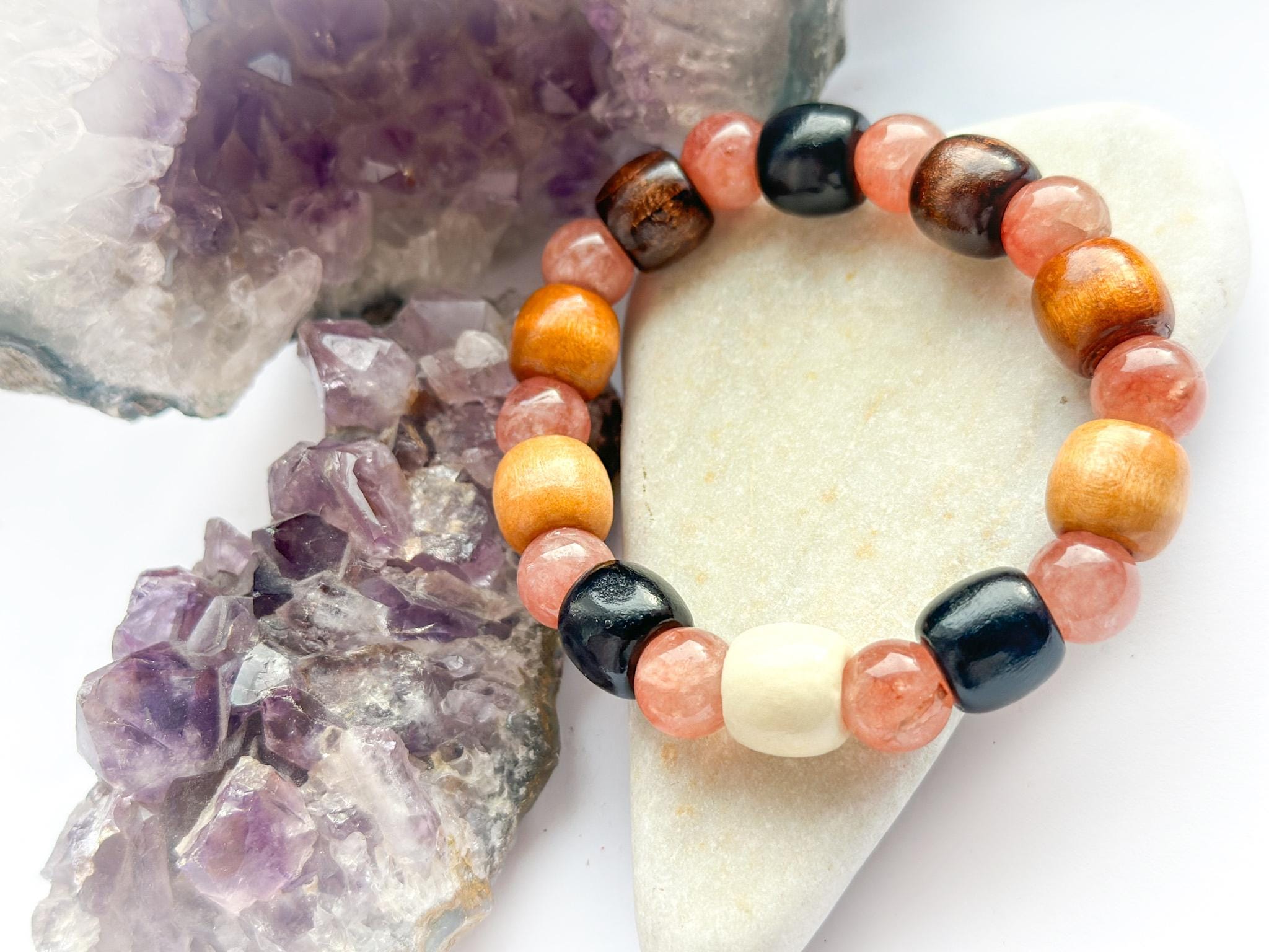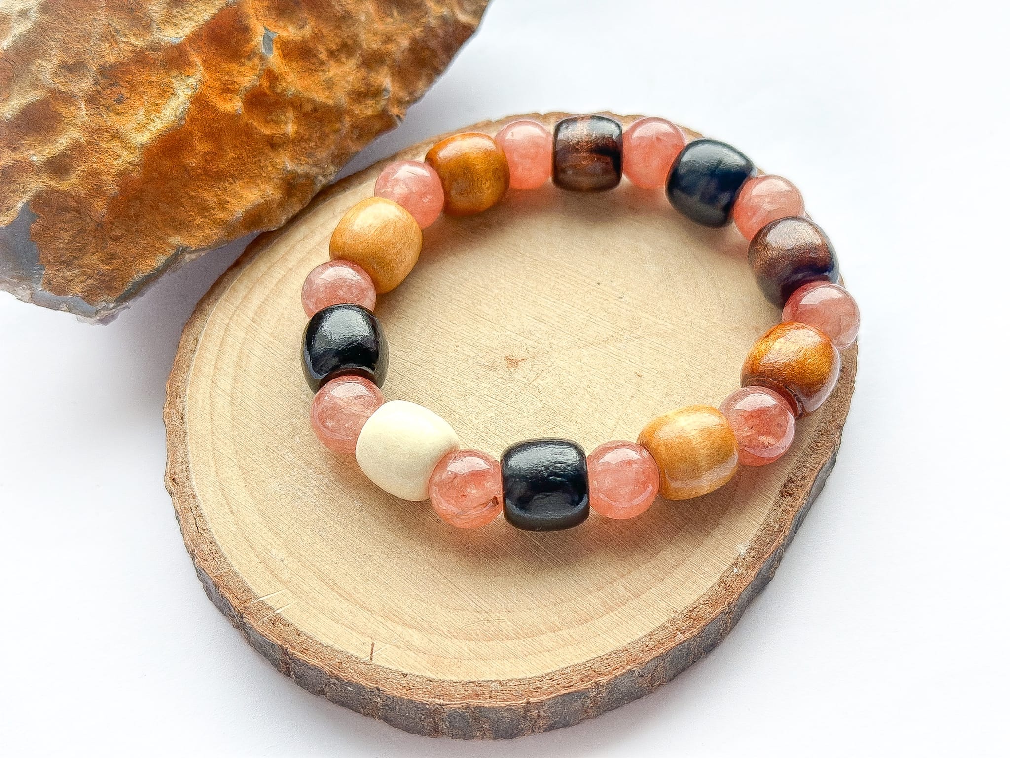 Bransoletka została wykonana ręcznie z naturalnych kamieni i wykończona drewnianymi koralikami w ciepłych odcieniach, które pięknie podkreślają „słoneczny” charakter kamienia oraz czystą, jasną biel jadeitu. Naturalne drewno dodaje biżuterii lekkości i organicznego uroku, a jednocześnie ociepla całą kompozycję.