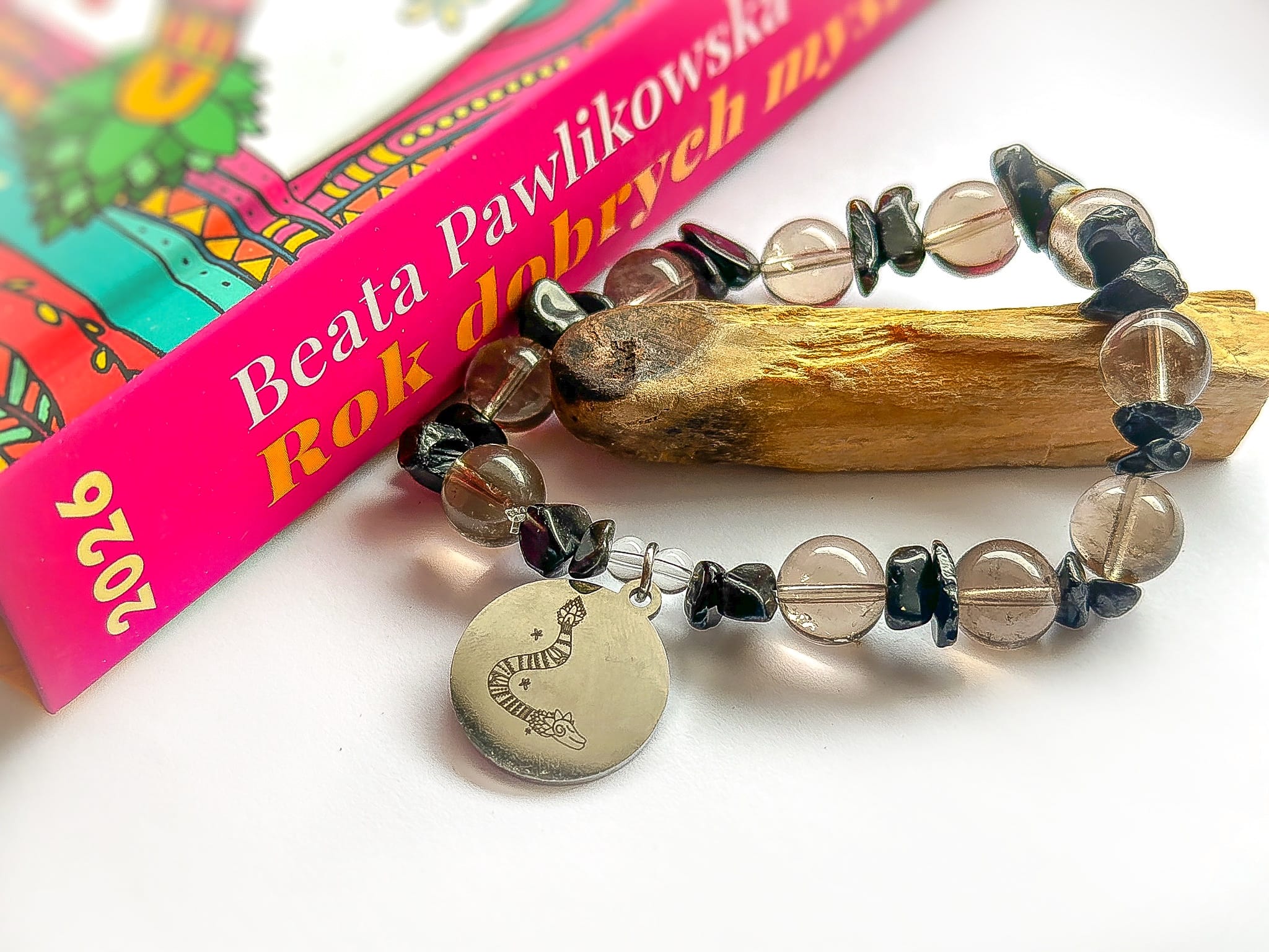 Bransoletka z turmalinu i kwarcu dymnego z przywieszką rysunkiem Beaty Pawlikowskiej Wąż Quetzalcoatl