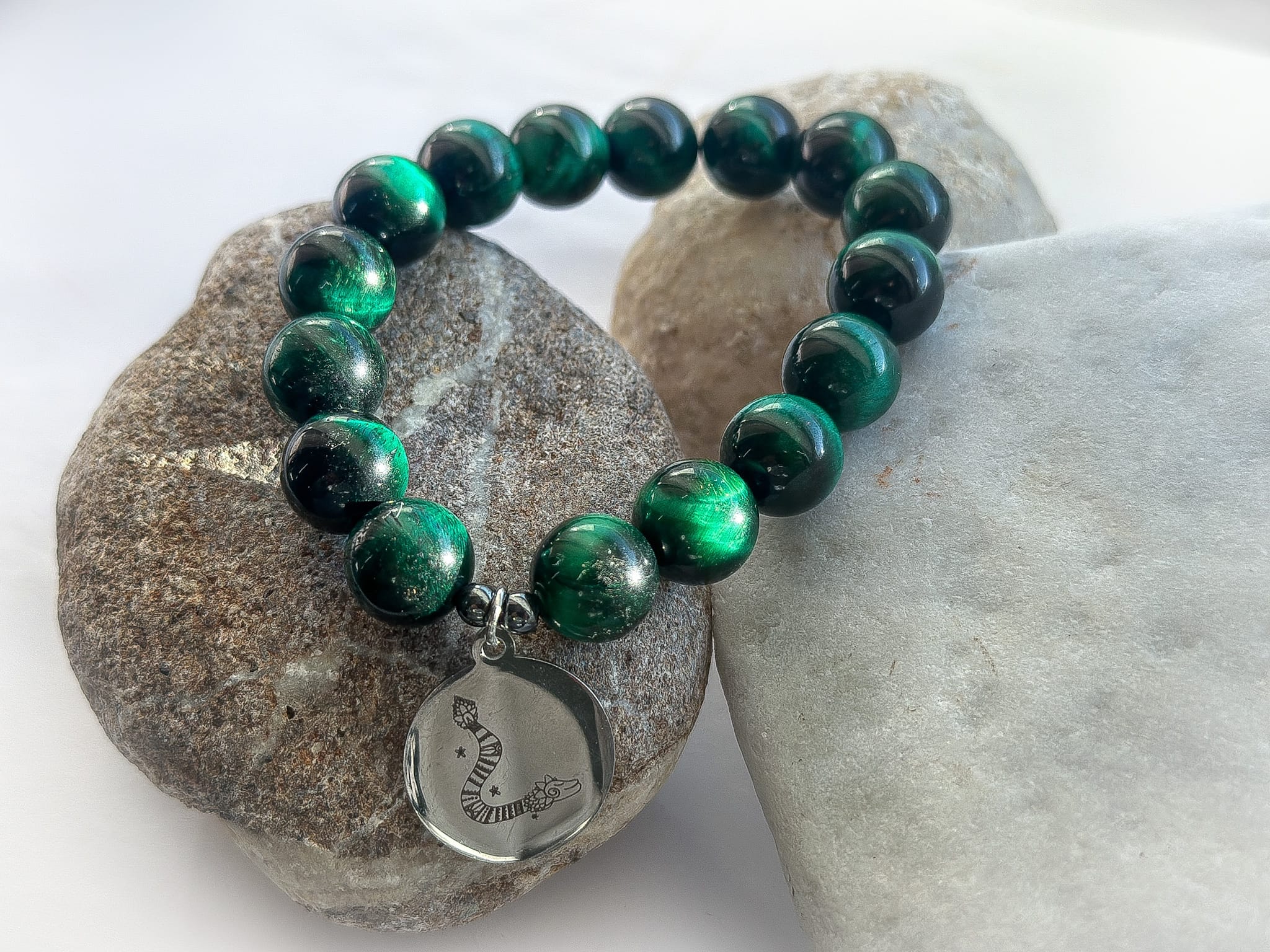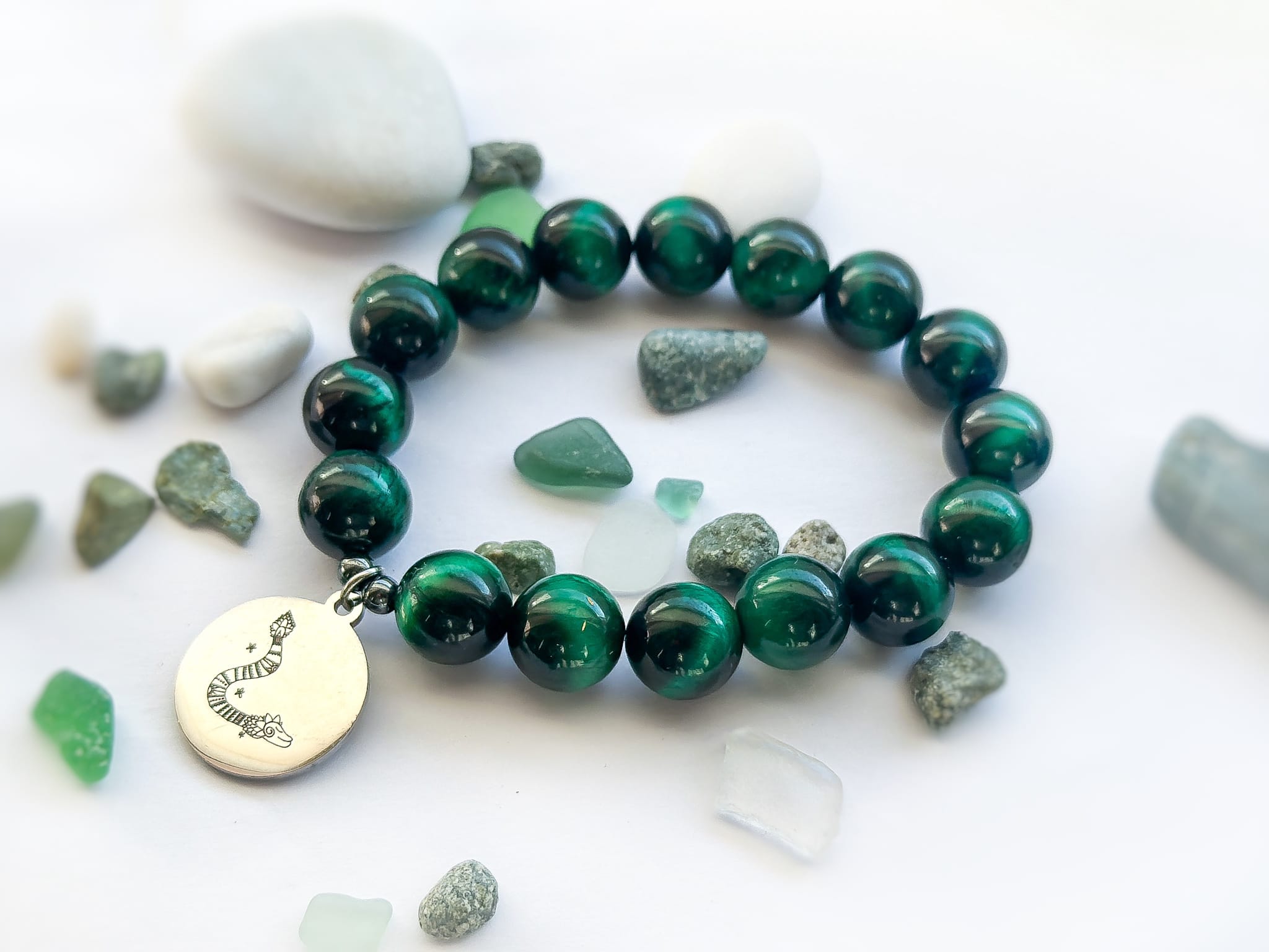 Bransoletka z zielonego tygrysiego oka z przywieszką „Pierzasty wąż” w odcieniu srebra– projekt Beaty Pawlikowskiej