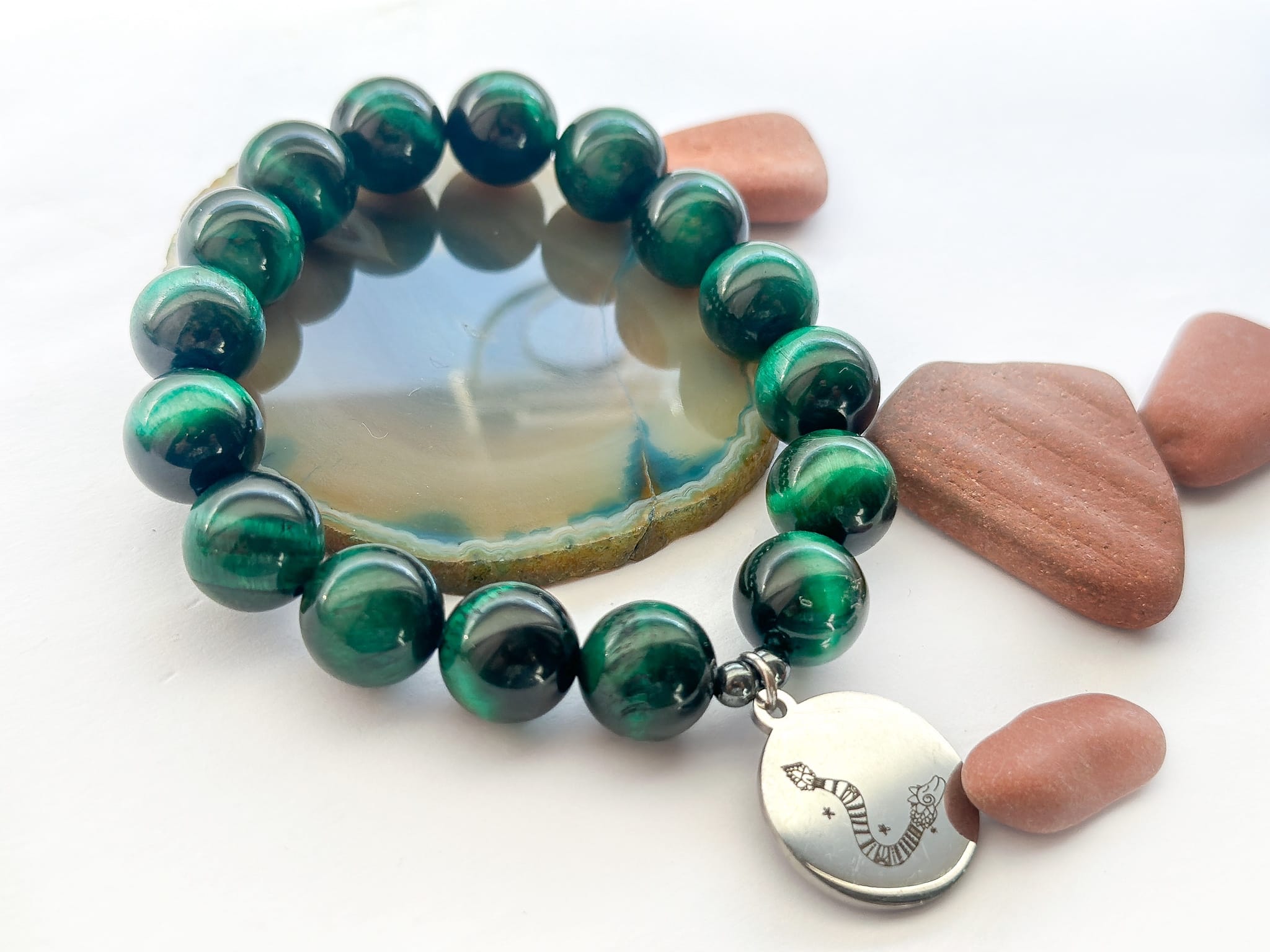 Tygrysie Oko to kamień odwagi, klarowności i intuicji zakorzenionej w ciele. Jego zielony odcień refleksy przypominają o sile ukrytej w ciszy, spokoju i pewności siebie –