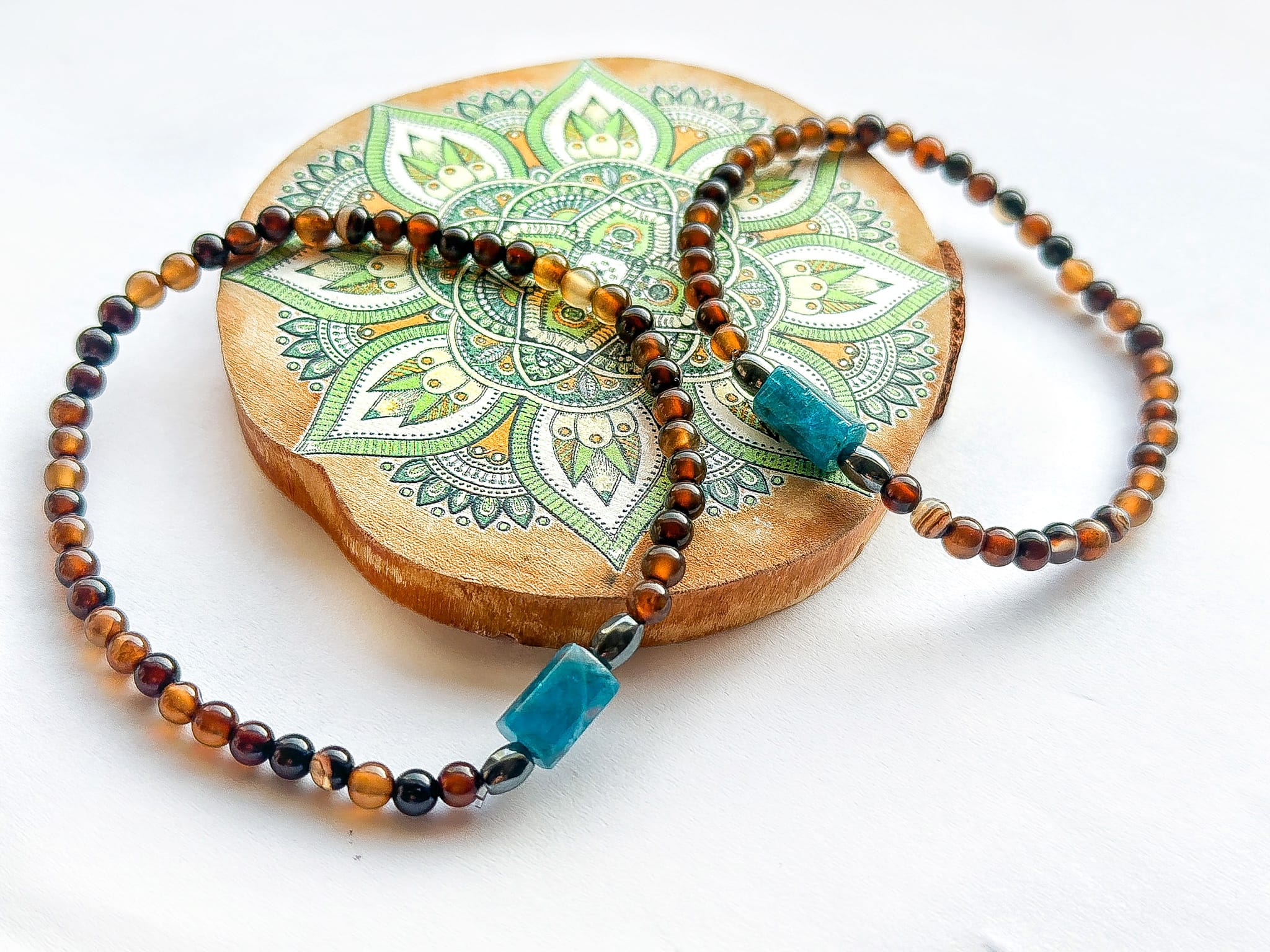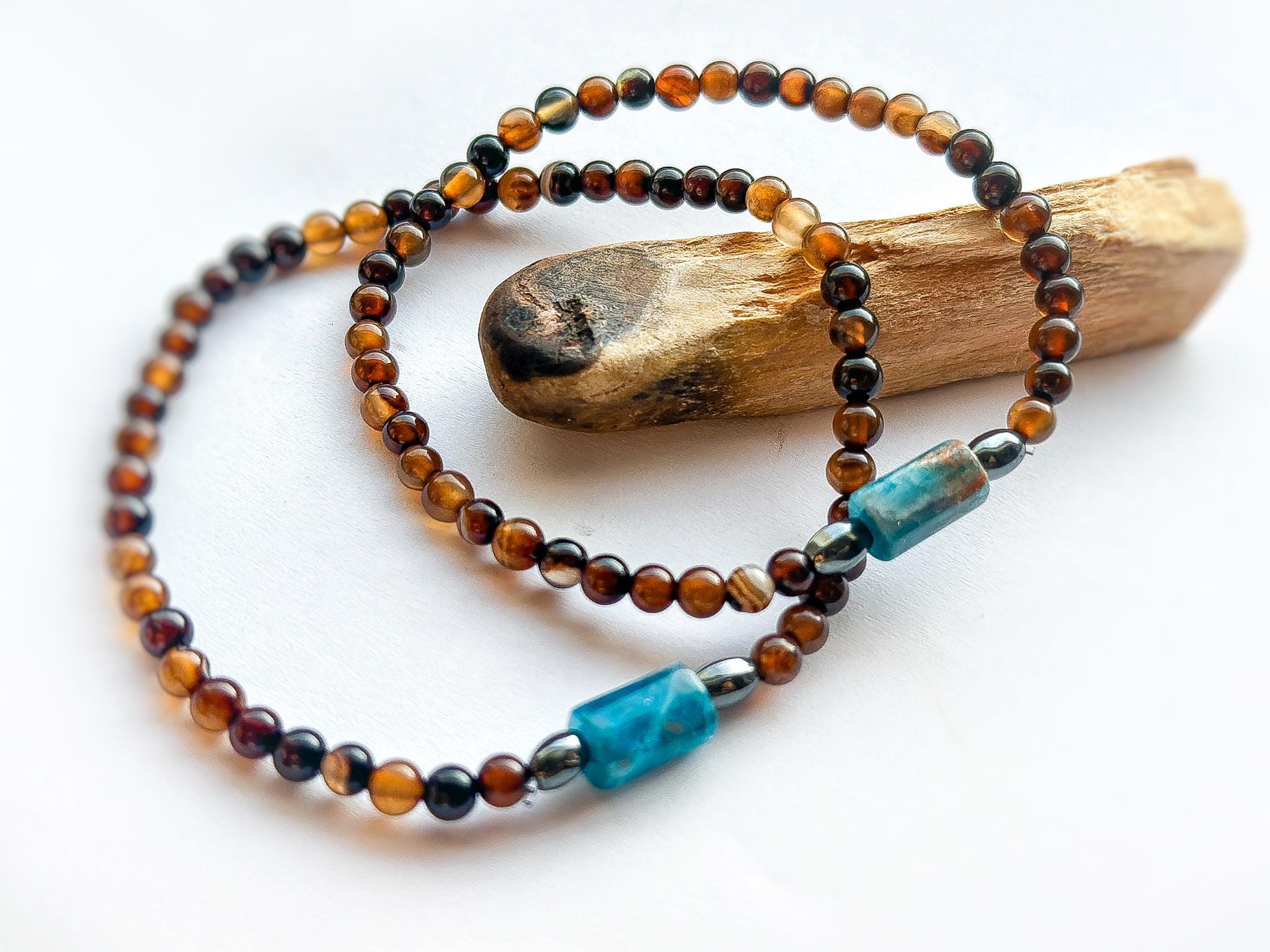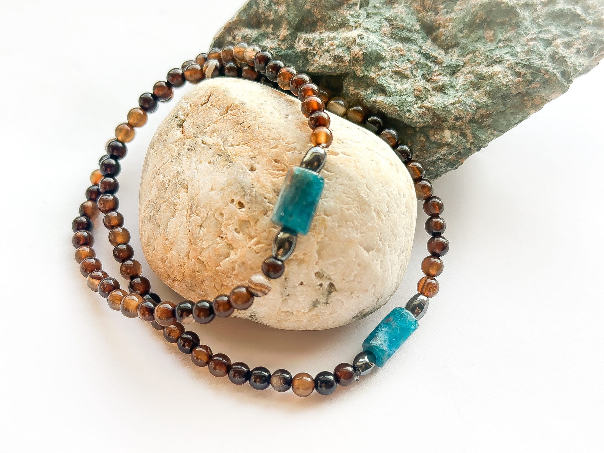 Naturalny brązowy agat połączony z intensywnym turkusem tworzy zestaw, który mówi jasno: jesteśmy razem, ale każdy z nas jest inny.