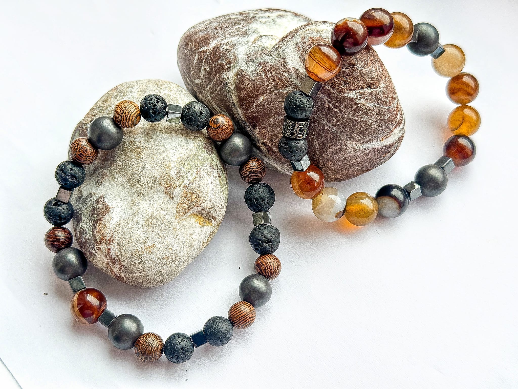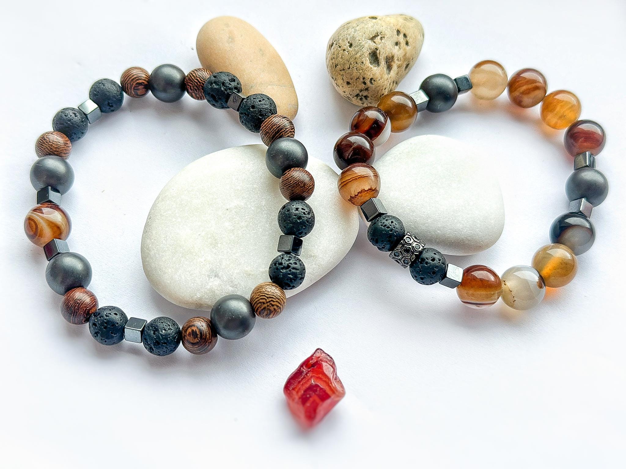 Komplet bransoletek z naturalnych kamieni i drewna, stworzony jako symbol równowagi, siły i bliskości. To biżuteria o ciepłej, ziemistej energii, inspirowana naturą i jej pierwotną mocą.