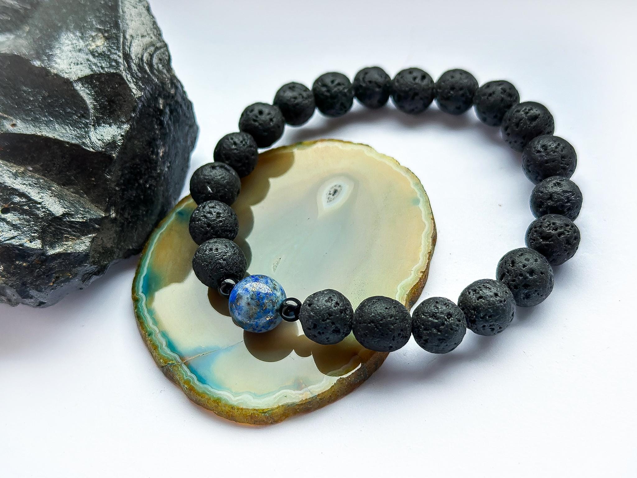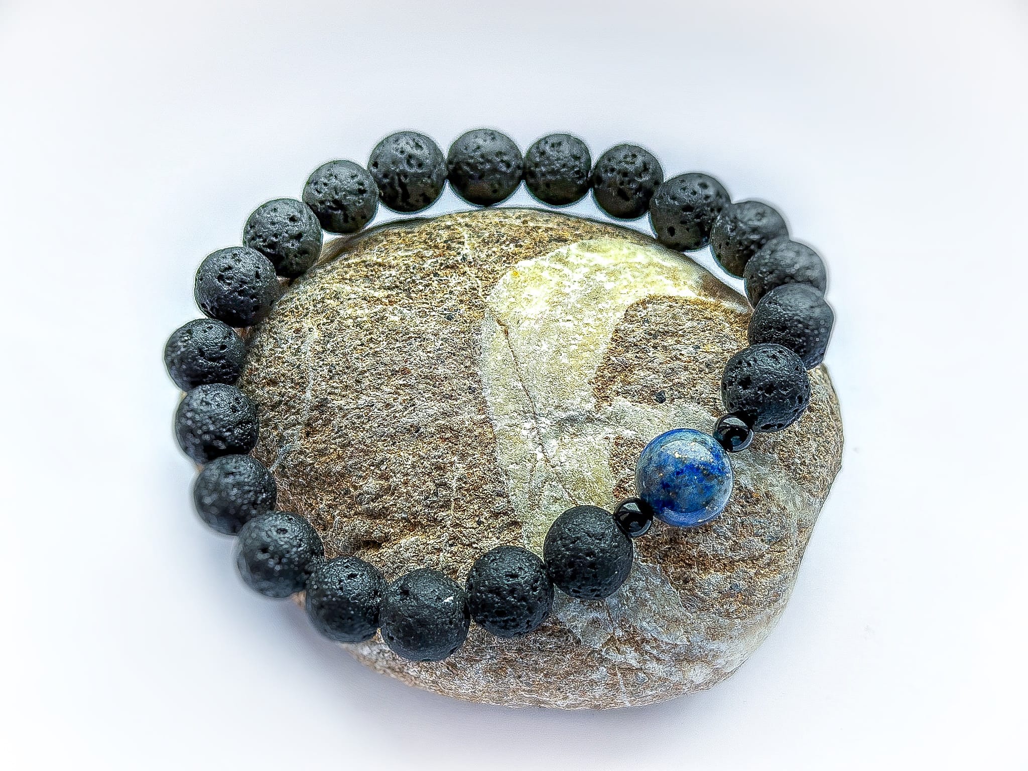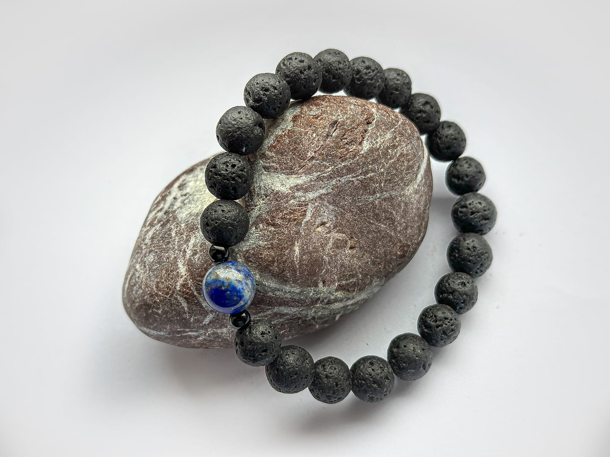 Męska bransoletka z lawy wulkanicznej, czarnego turmalinu i lapis lazuli — połączenie kamieni, które kojarzą się z siłą, uważnością i jasnością myśli.