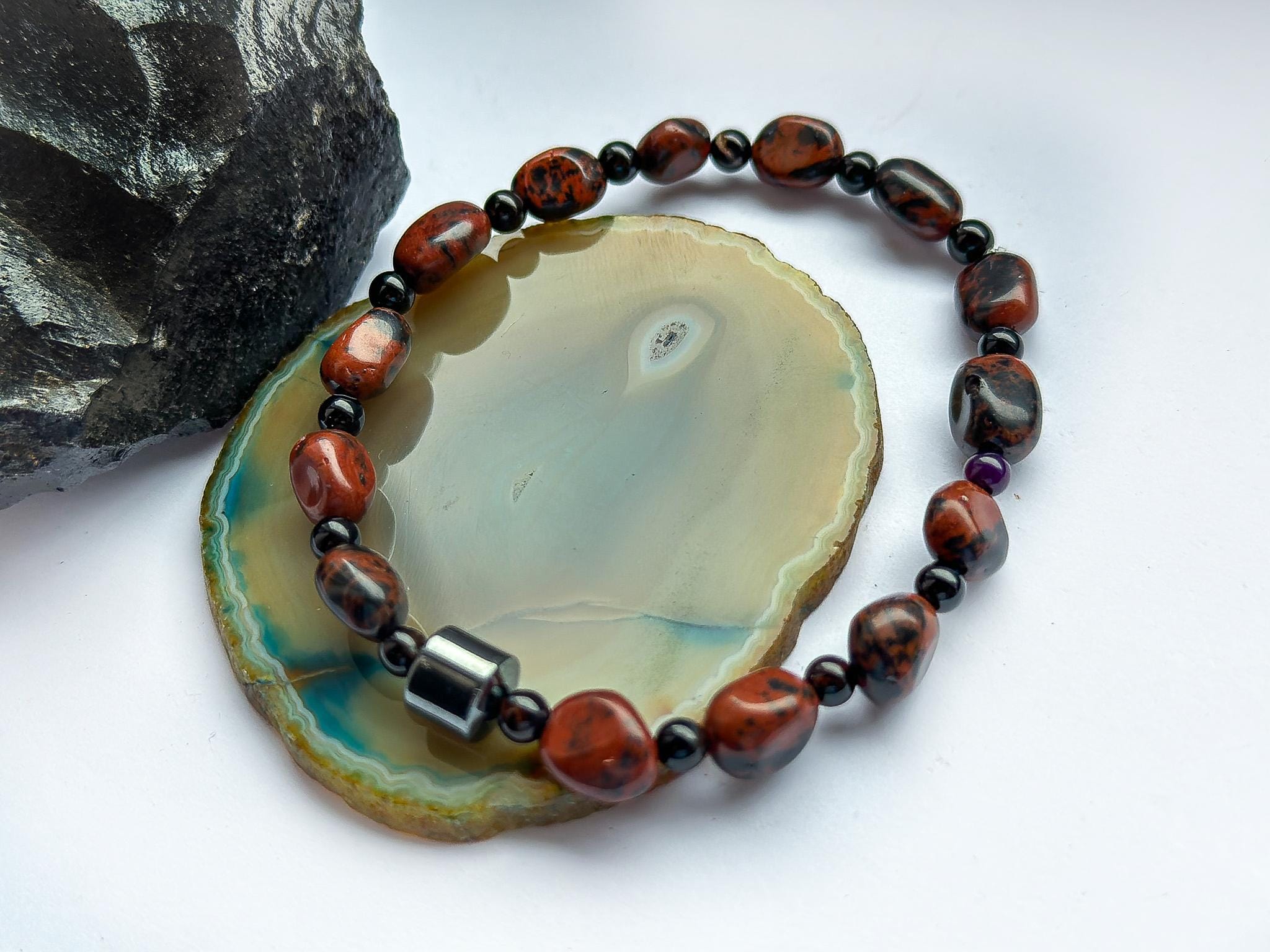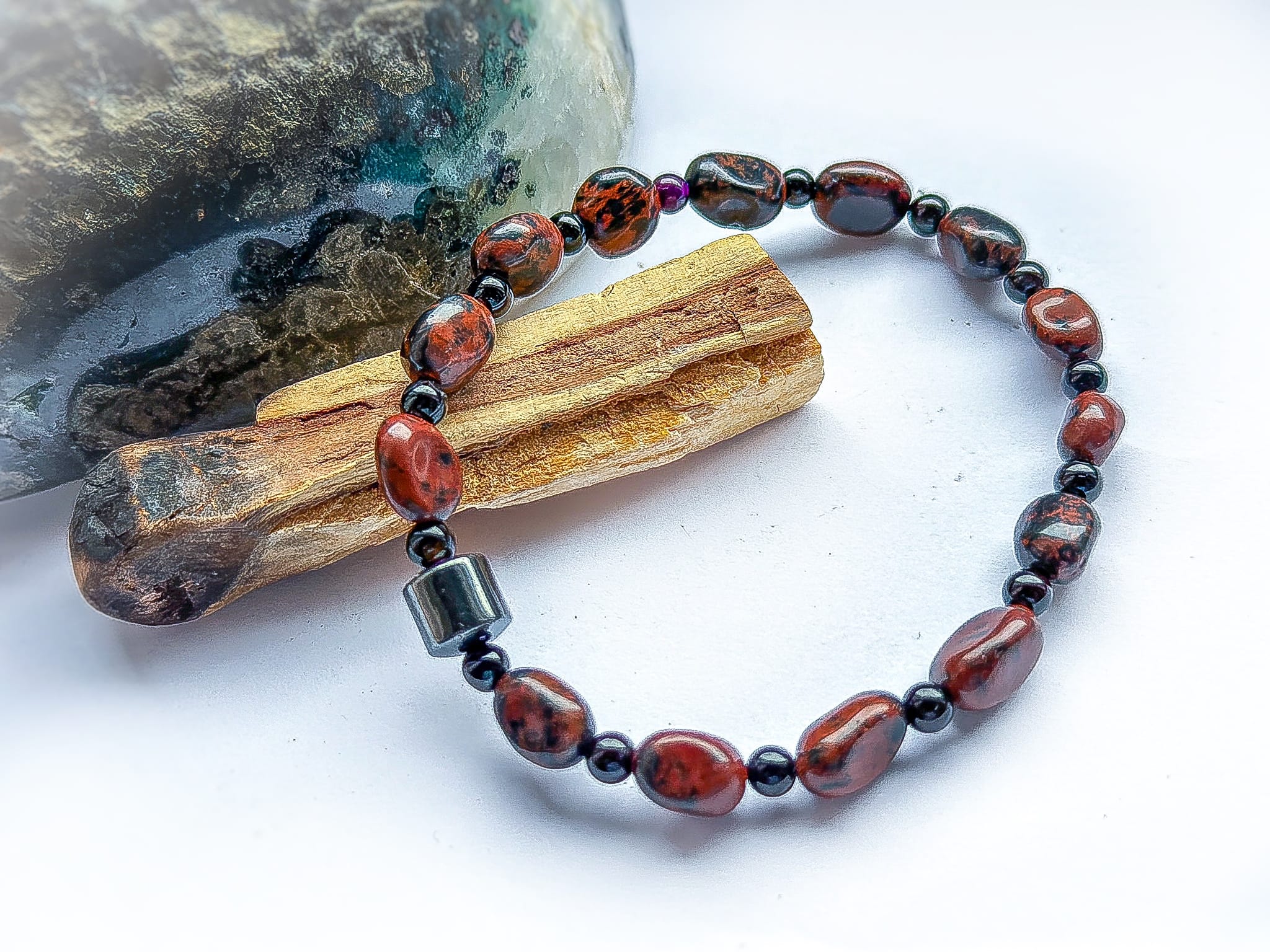 Męska bransoletka z jaspisu, czarnego turmalinu i hematytu  stworzona z kamieni, które od dawna kojarzone są z siłą, uważnością i spokojem zakorzenionym w codzienności.