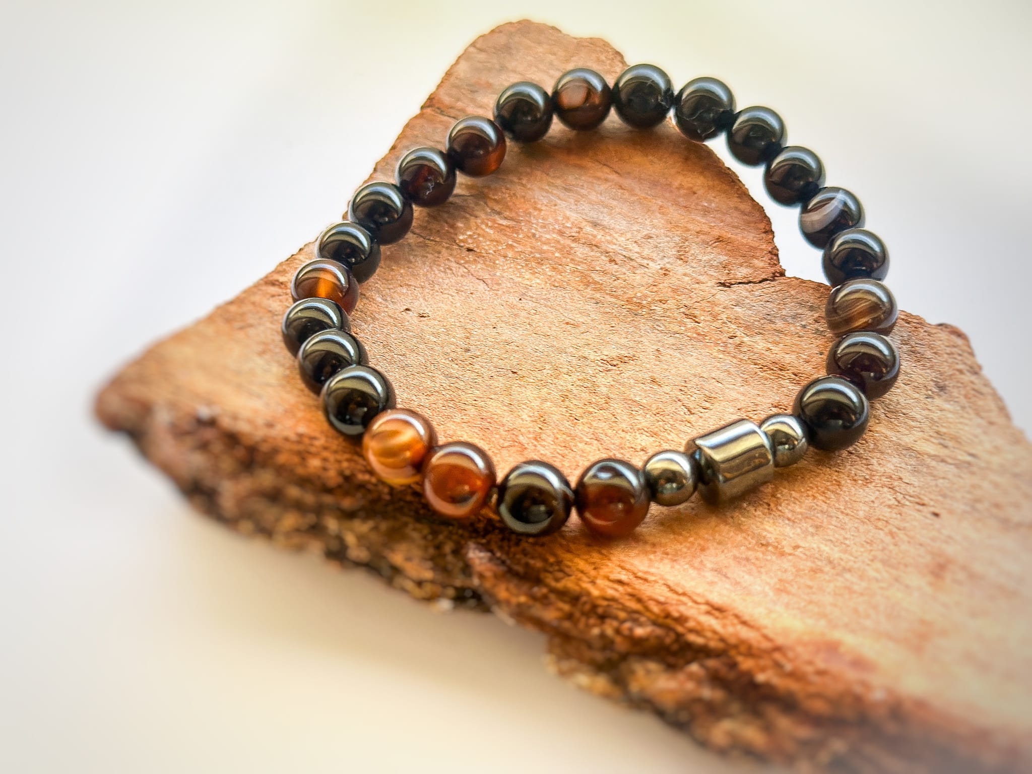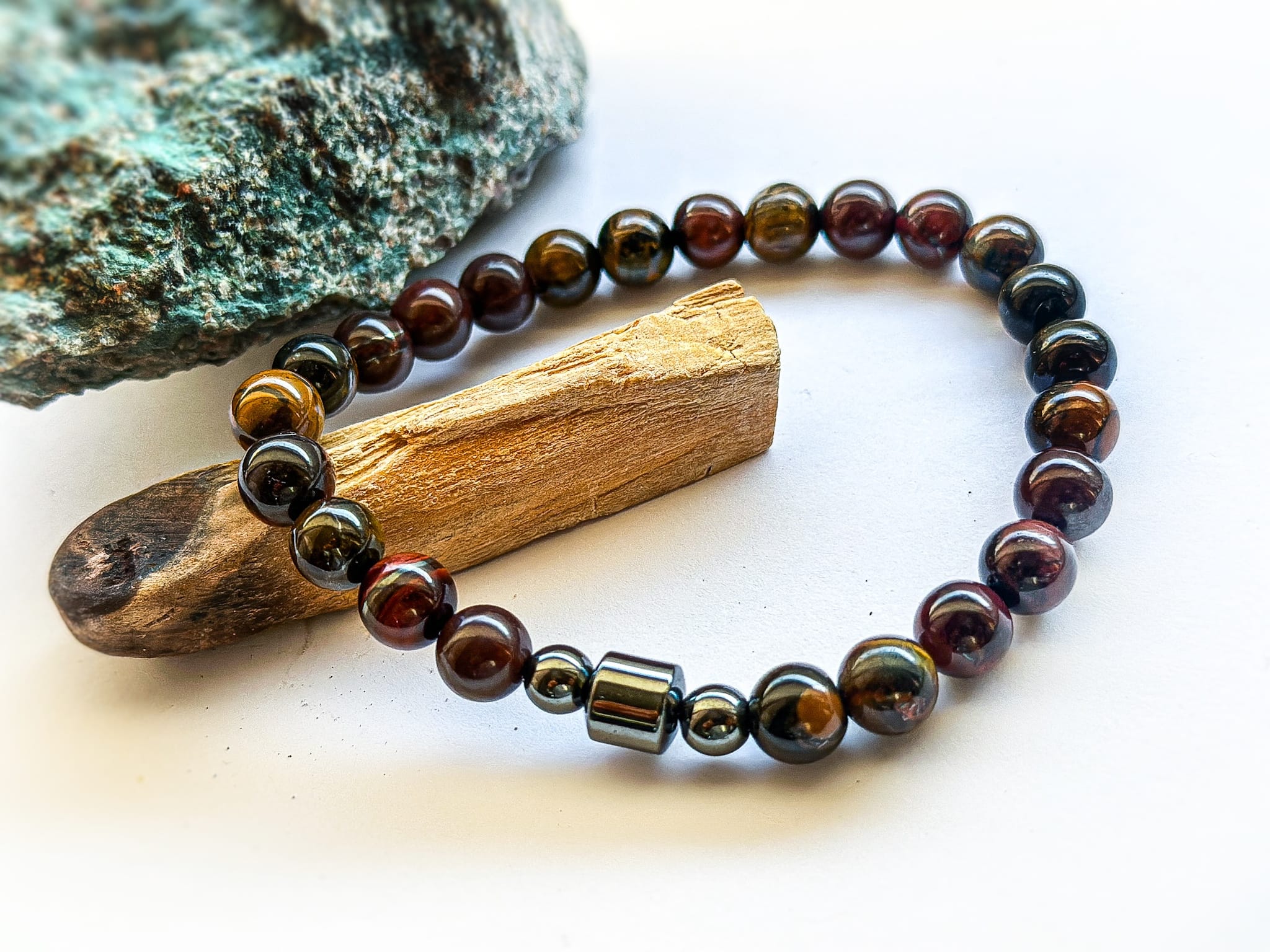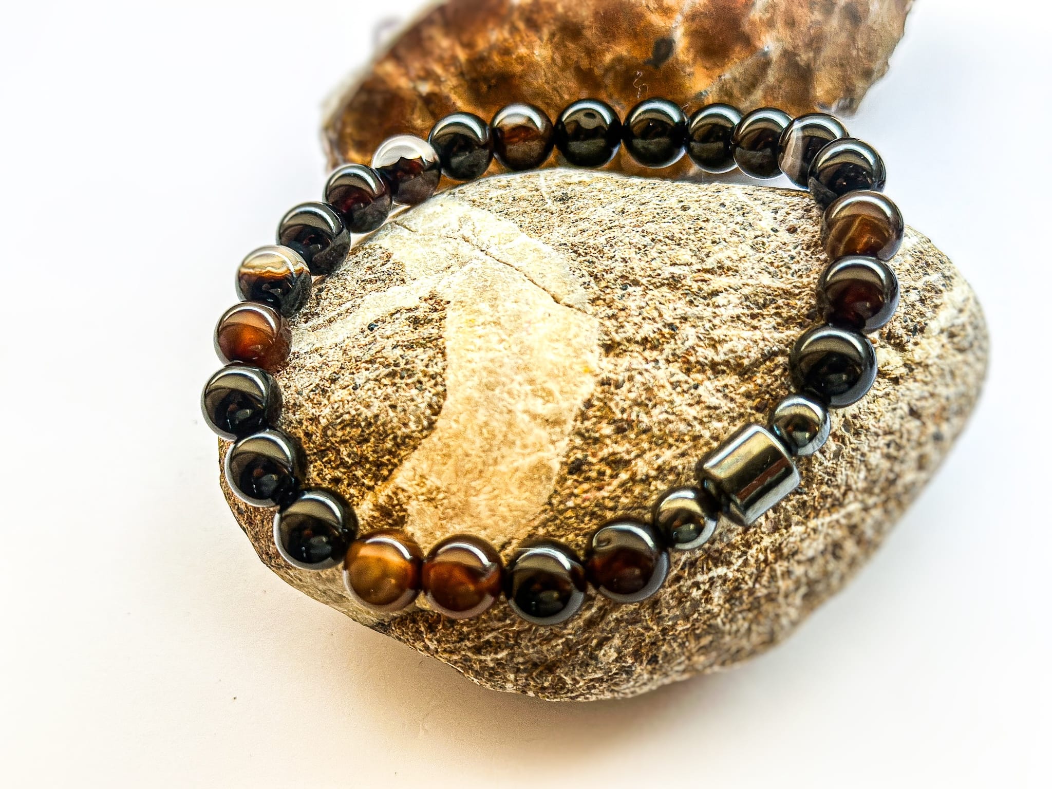 Męska bransoletka z hematytu i tygrysiego oka to połączenie chłodnego, metalicznego połysku z ciepłą, charakterystyczną grą barw. Prosta forma i dwa wyraziste kamienie dają efekt, który wyróżnia się, ale bez przesady dokładnie tak, jak lubią męskie dodatki.