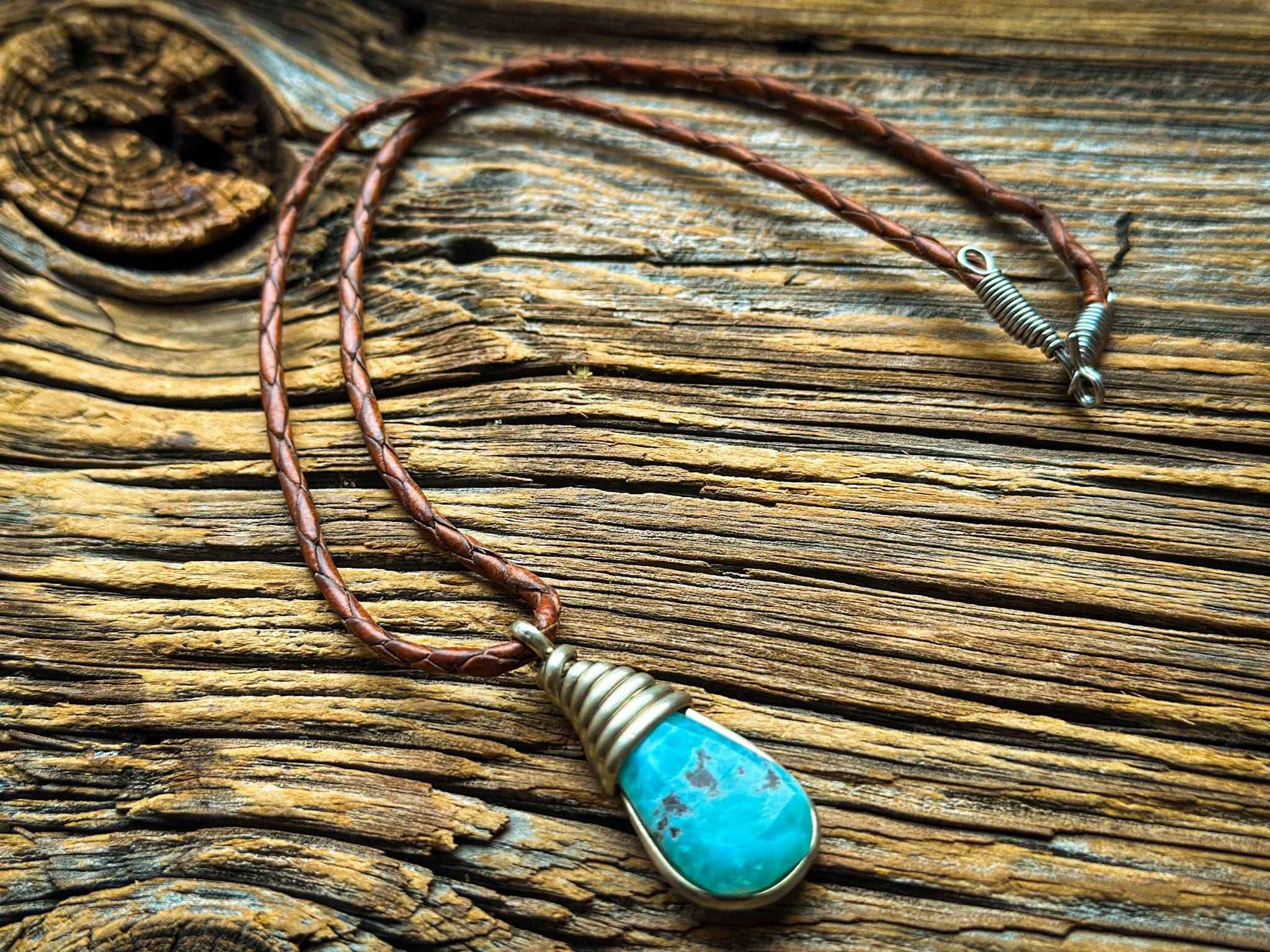 Centralnym elementem jest turkus – naturalny kamień o intensywnym, niebiesko-zielonym kolorze z charakterystycznymi żyłkami i przebarwieniami. Każdy kamień ma swój unikalny rysunek, dzięki czemu nie ma dwóch identycznych naszyjników. Turkus został oprawiony w ręcznie wykonane metalowe osadzenie, które podkreśla jego surowy, naturalny charakter. Całość zawieszona jest na plecionym łańcuszku, nadającym biżuterii etniczny, podróżniczy klimat.