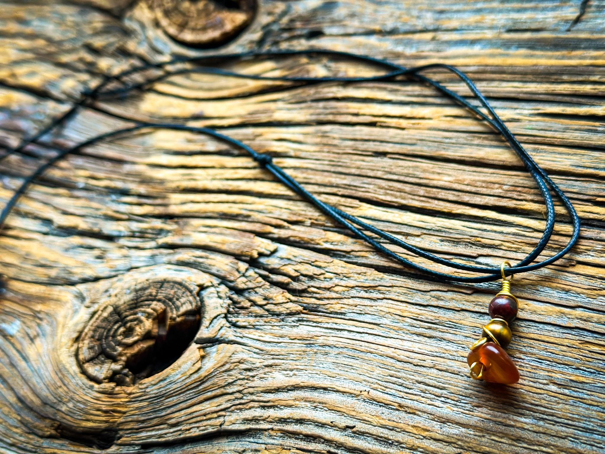 Naszyjnik łączy dwa naturalne kamienie: tygrysie oko i czerwony jaspis, tworząc harmonijną, ziemistą kompozycję. Kamienie zostały ręcznie połączone i zawieszone na lekkim, regulowanym sznurku, dzięki czemu naszyjnik można nosić zarówno blisko szyi, jak i w dłuższej formie.