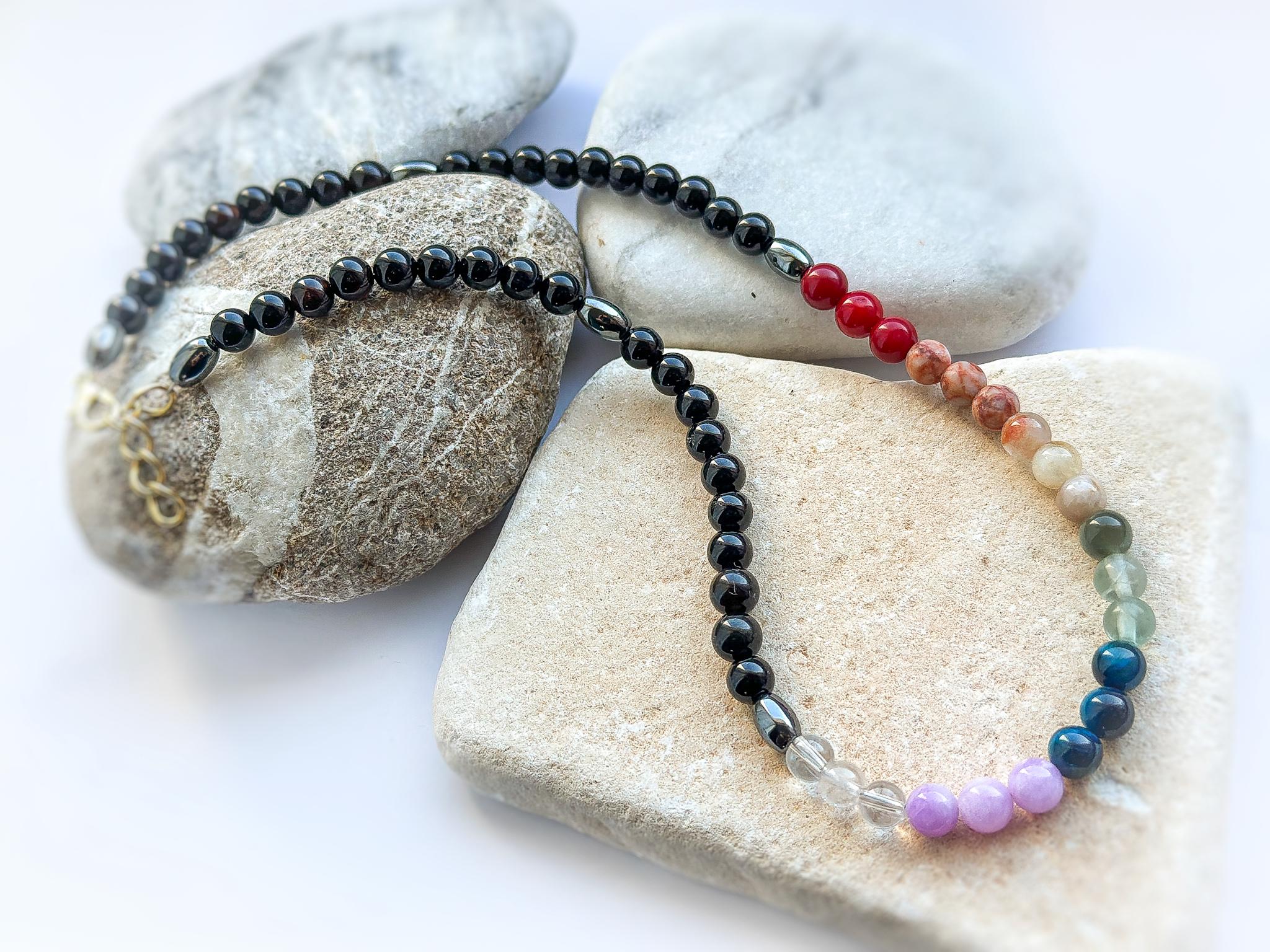 Ręcznie wykonany naszyjnik z naturalnego czarnego turmalinu, uzupełniony zestawem kamieni w kolorach symbolicznie odpowiadających siedmiu czakrom.